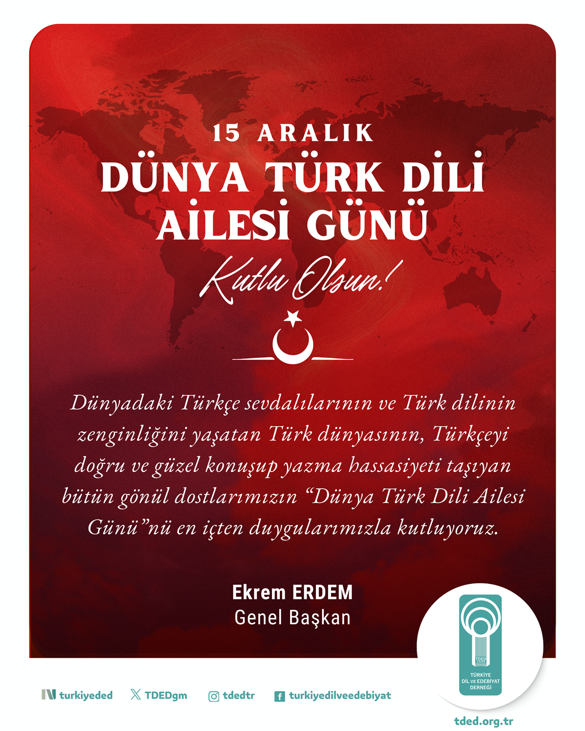 15/12/2025Dünyadaki Türkçe sevdalılarının ve Türk dilinin zenginliğini yaşatan Türk dünyasının, Türkçeyi doğru ve güzel konuşup yazma hassasiyeti taşıyan bütün gönül dostlarımızın “Dünya Türk Dili Ailesi Günü”nü en içten duygularımızla kutluyoruz.
