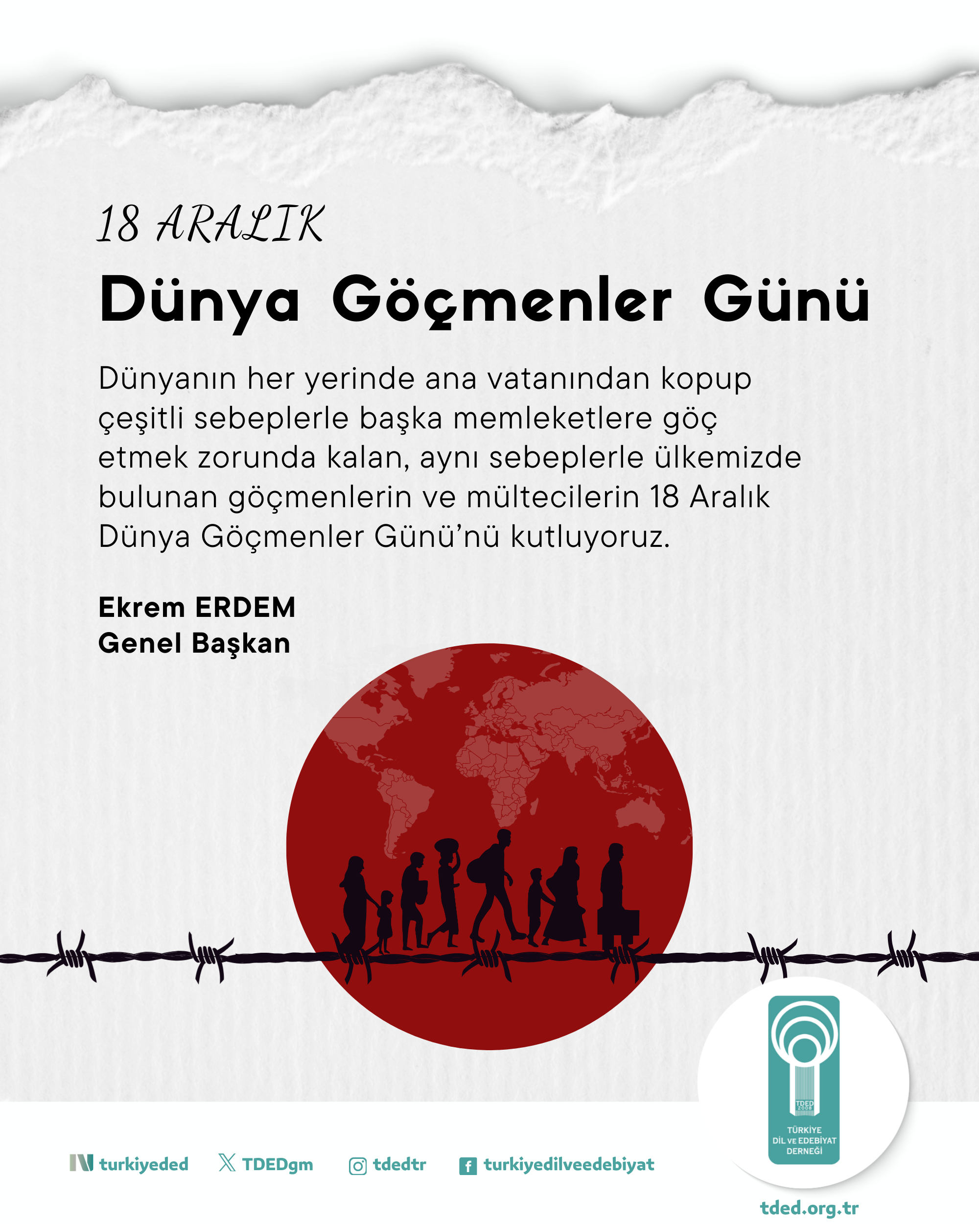 17/12/2025Dünyanın her yerinde ana vatanından kopup çeşitli sebeplerle başka memleketlere göç etmek zorunda kalan, aynı sebeplerle ülkemizde bulunan göçmenlerin ve mültecilerin 18 Aralık Dünya Göçmenler Günü’nü kutluyoruz.