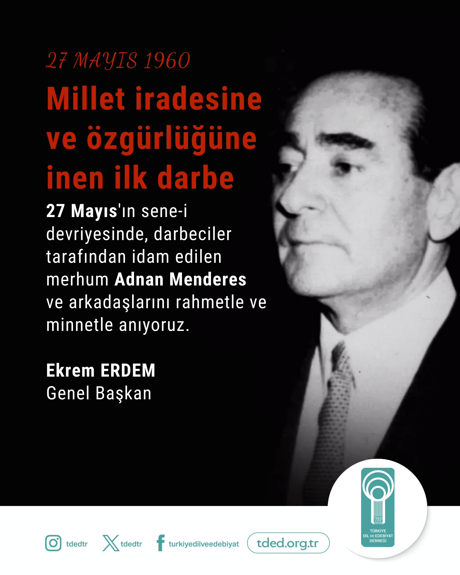 Anasayfa 27 MAYIS DARBESİ 27 MAYIS DARBESİ 27/05/2025 Millet iradesine ve özgürlüğüne inen ilk darbe 27 Mayıs'ın sene-i devriyesinde, darbeciler tarafından idam edilen merhum Adnan Menderes ve arkadaşlarını rahmetle ve minnetle anıyoruz. Ekrem ERDEM Genel Başkan Galeri