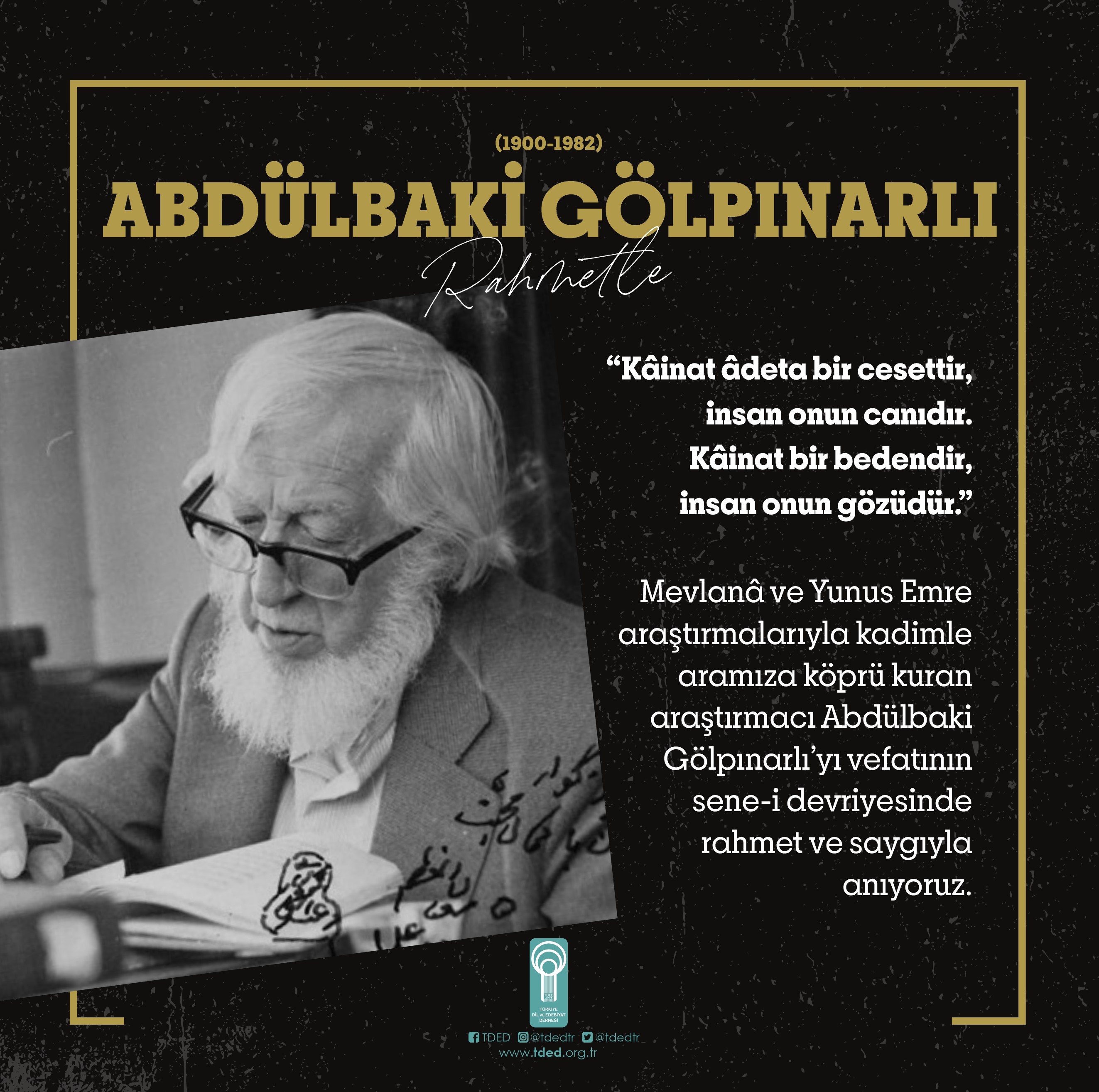 Mevlanâ ve Yunus Emre araştırmalarıyla kadimle aramıza köprü kuran araştırmacı Abdülbaki Gölpınarlı’yı vefatının sene-i devriyesinde rahmet ve saygıyla anıyoruz.