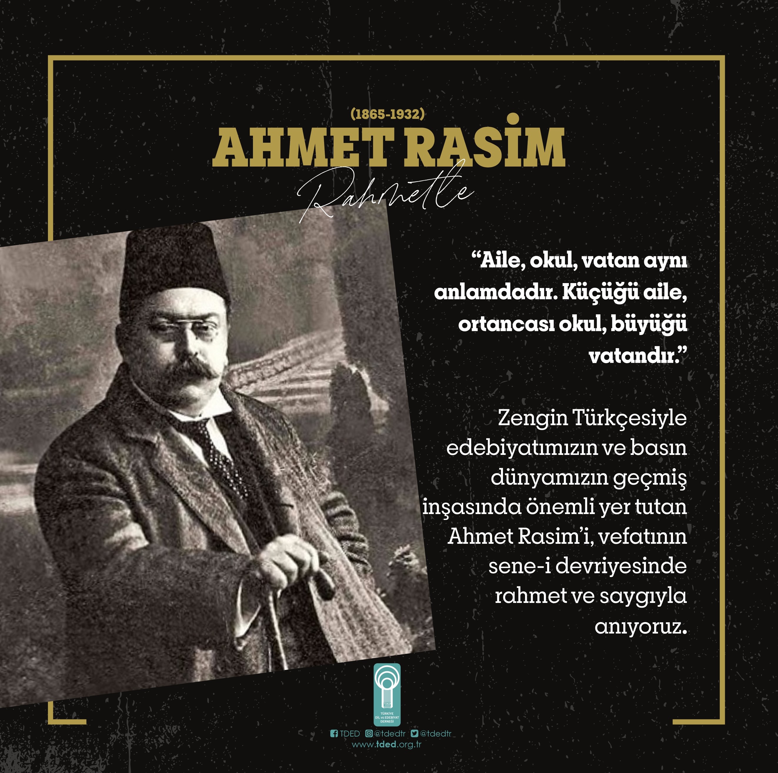 Zengin Türkçesiyle edebiyatımızın ve basın dünyamızın geçmiş inşasında önemli yer tutan Ahmet Rasim’i, vefatının sene-i devriyesinde rahmet ve saygıyla anıyoruz.