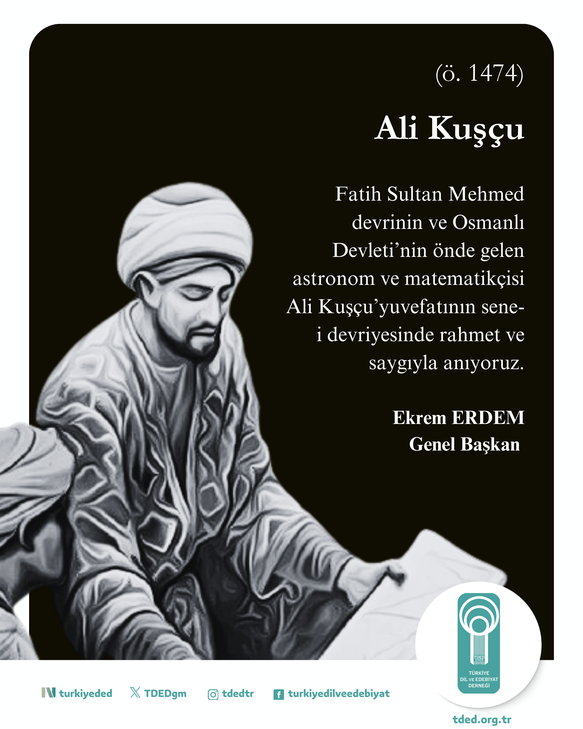 16/12/2025Fatih Sultan Mehmed devrinin ve Osmanlı Devleti’nin önde gelen astronom ve matematikçisi Ali Kuşçu’yuvefatının sene-i devriyesinde rahmet ve saygıyla anıyoruz.