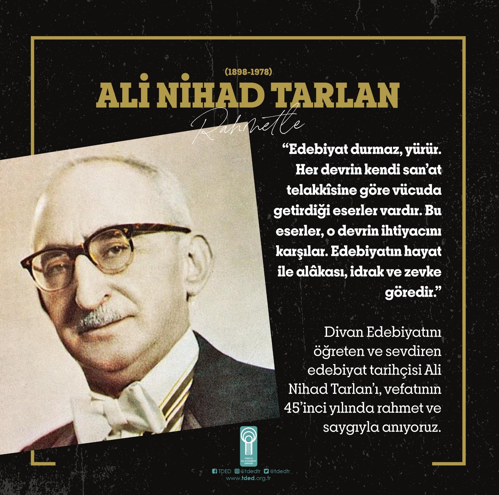 Divan Edebiyatını öğreten ve sevdiren edebiyat tarihçisi Ali Nihad Tarlan’ı, vefatının 45’inci yılında rahmet ve saygıyla anıyoruz.