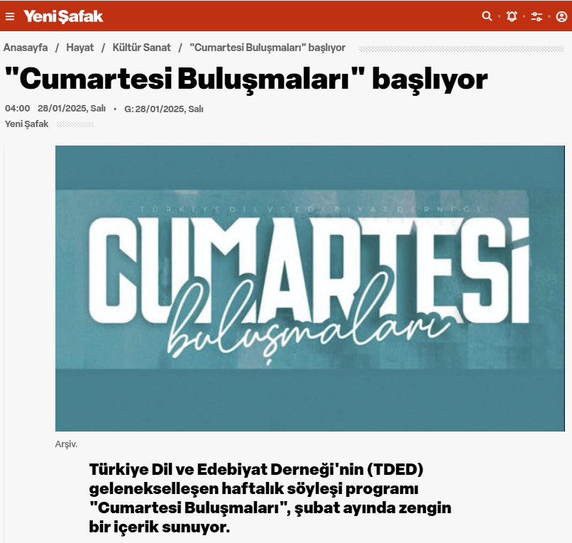 31/01/2025 Türkiye Dil ve Edebiyat Derneği'nin (TDED) gelenekselleşen haftalık söyleşi programı "Cumartesi Buluşmaları", şubat ayında zengin bir içerik sunuyor.