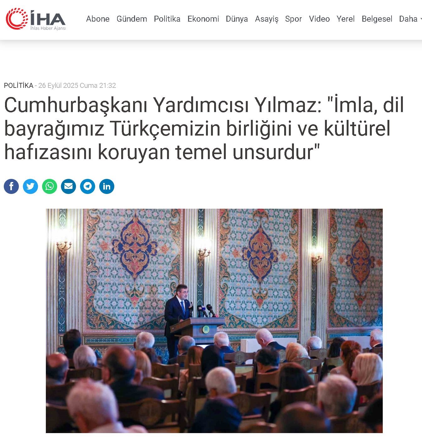 26/09/2025İstanbul Üniversitesi’nde ‘Geçmişten Günümüze Türkçe’nin İmlası Uluslararası Sempozyumu’na katılan Cumhurbaşkanı Yardımcısı Cevdet Yılmaz, "Tarihi derinliği ve coğrafi genişliği ile Türkçe bir yandan zengin bir söz varlığı da ifade kabiliyetine erişmiş, diğer yandan ise yazı dilinde doğal dönüşümler geçirmiştir. İmla, dil bayrağımız Türkçemizin anlaşılabilirliğini, birliğini ve kültürel hafızasını koruyan temel unsurdur" dedi.