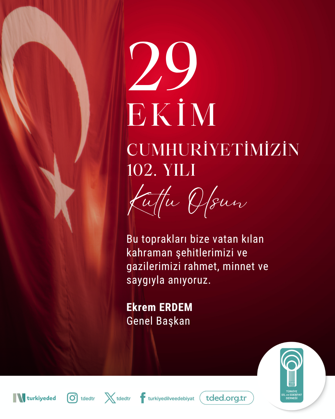 Anasayfa CUMHURİYET BAYRAMI'NIN 102. YILI CUMHURİYET BAYRAMI'NIN 102. YILI 29/10/2025 29 Ekim Cumhuriyet Bayramı ve Cumhuriyetimizin 102. yılı kutlu olsun.Bu toprakları bize vatan kılan kahraman şehitlerimizi ve gazilerimizi rahmet, minnet ve saygıyla anıyoruz.Ekrem ERDEM Genel Başkan Galeri