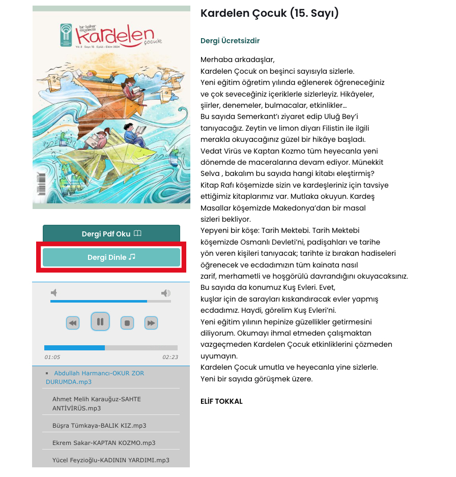 Kardelen Çocuk 15. Sayıya ait seslendirilen “DERGİ DİNLE” bölümümüzden ulaşabileceğiniz 5 metin şöyle: