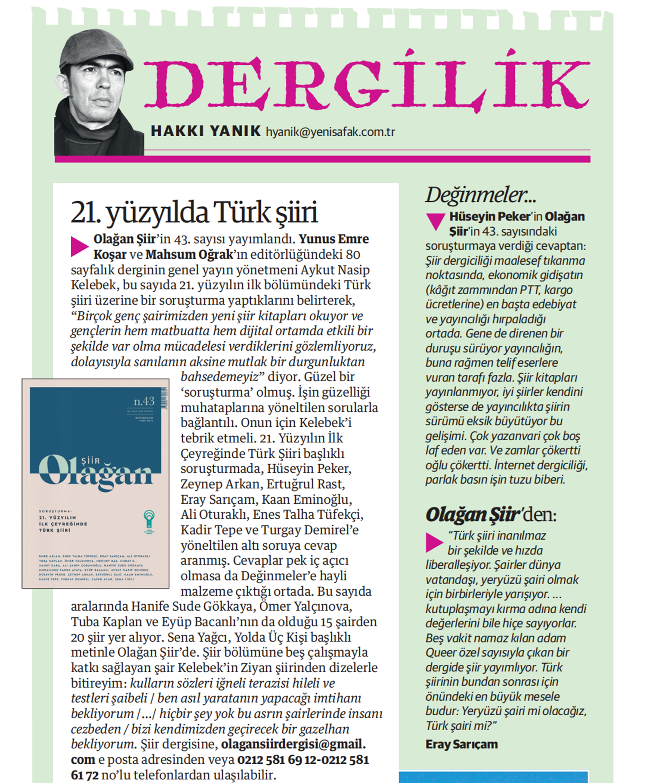 Olağan Şiir’in 43. sayısı yayımlandı. Yunus Emre Koşar ve Mahsum Oğrak’ın editörlüğündeki 80 sayfalık derginin genel yayın yönetmeni Aykut Nasip Kelebek, bu sayıda 21. yüzyılın ilk bölümündeki Türk şiiri üzerine bir soruşturma yaptıklarını belirterek, “Birçok genç şairimizden yeni şiir kitapları okuyor ve gençlerin hem matbuatta hem dijital ortamda etkili bir şekilde var olma mücadelesi verdiklerini gözlemliyoruz, dolayısıyla sanılanın aksine mutlak bir durgunluktan bahsedemeyiz” diyor. Güzel bir ‘soruşturma’ olmuş. İşin güzelliği muhataplarına yöneltilen sorularla bağlantılı. Onun için Kelebek’i tebrik etmeli. 21. Yüzyılın İlk Çeyreğinde Türk Şiiri başlıklı soruşturmada, Hüseyin Peker, Zeynep Arkan, Ertuğrul Rast, Eray Sarıçam, Kaan Eminoğlu, Ali Oturaklı, Enes Talha Tüfekçi, Kadir Tepe ve Turgay Demirel’e yöneltilen altı soruya cevap aranmış. Cevaplar pek iç açıcı olmasa da Değinmeler’e hayli malzeme çıktığı ortada. Bu sayıda aralarında Hanife Sude Gökkaya, Ömer Yalçınova, Tuba Kaplan ve Eyüp Bacanlı’nın da olduğu 15 şairden 20 şiir yer alıyor. Sena Yağcı, Yolda Üç Kişi başlıklı metinle Olağan Şiir’de. Şiir bölümüne beş çalışmayla katkı sağlayan şair Kelebek’in Ziyan şiirinden dizelerle bitireyim: kulların sözleri iğneli terazisi hileli ve testleri şaibeli / ben asıl yaratanın yapacağı imtihanı bekliyorum /…/ hiçbir şey yok bu asrın şairlerinde insanı cezbeden / bizi kendimizden geçirecek bir gazelhan bekliyorum. Şiir dergisine, olagansiirdergisi@gmail.com e posta adresinden veya 0212 581 69 12-0212 581 61 72 no’lu telefonlardan ulaşılabilir.