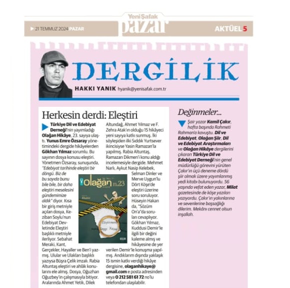 21/07/2024Türkiye Dil ve Edebiyat Derneği’nin yayımladığı Olağan Hikâye, 23. sayıya ulaştı. Yunus Emre Özsaray yönetimindeki dergide hikâyelerden Gökhan Yılmaz sorumlu. Bu sayının dosya konusu eleştiri. Yönetmen Özsaray, sunuşunda, “Edebiyat tarihinde eleştiri bir döngü. Biz de bu sayıda bunu bile bile, bir daha eleştiri meselesini gündemimize aldık” diyor. Kısa bir giriş metniyle açılan dosya, Keziban Soylu’nun Edebiyat Devletinde Eleştiri başlıklı metniyle ilerliyor. Sebahat Meraki, Kant, Gerçekler, Hayaller ve Ben’i yazmış. Ulular ve Ulakları başlıklı yazıysa Büşra Çelik imzalı. Rabia Altuntaş eleştiri ve ahlâk konularını ele almış. Dosya, Oğuzhan Oğuzbey’in çalışmasıyla bitiyor. Aralarında Ahmet Yetik, Dilek Altundağ, Ahmet Yılmaz ve F. Zehra Atak’ın olduğu 15 hikâyeci yeni sayıya katkı sunmuş. İki söyleşiden ilki Sıddık Yurtsever ikincisiyse Yasin Ramazan’la yapılmış. Rabia Altuntaş, Ramazan Dikmen’i konu aldığı incelemesiyle dergide. Mehmet Narlı, Aykut Nasip Kelebek, Selman Dinler ve Merve Uygun’lu Dört Köşe’de eleştiri üzerine soru soruluyor. Hüseyin Hakan da, “Sözüm On’a”da soruları cevaplıyor. Gökhan Yılmaz, Kuddusi Demir’le ilgili bir değini kaleme almış ve hikâyesine de yer verilen Demir’le konuşma yapılmış. Andıklarım dışında yaklaşık 15 ismin katkı verdiği hikâye dergisine, olaganhikaye@ gmail.com e posta adresinden veya 0 212 581 61 72 no’lu telefondan ulaşılabilir.