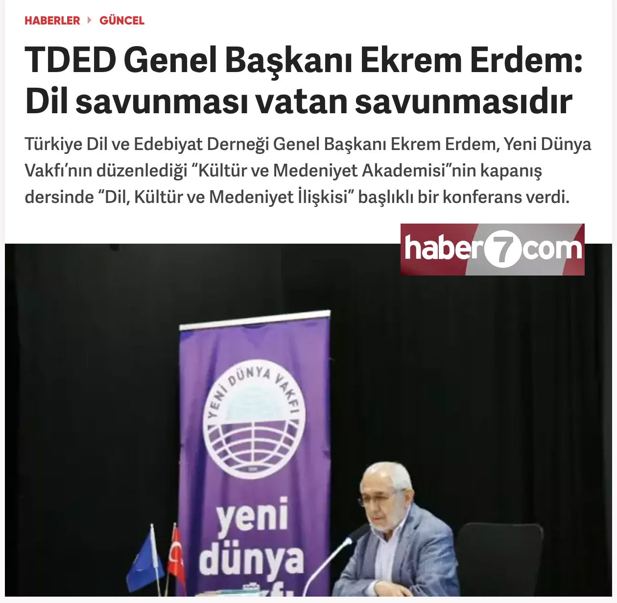 13/05/2024Türkiye Dil ve Edebiyat Derneği Genel Başkanı Ekrem Erdem, Yeni Dünya Vakfı’nın düzenlediği “Kültür ve Medeniyet Akademisi”nin kapanış dersinde “Dil, Kültür ve Medeniyet İlişkisi” başlıklı bir konferans verdi.