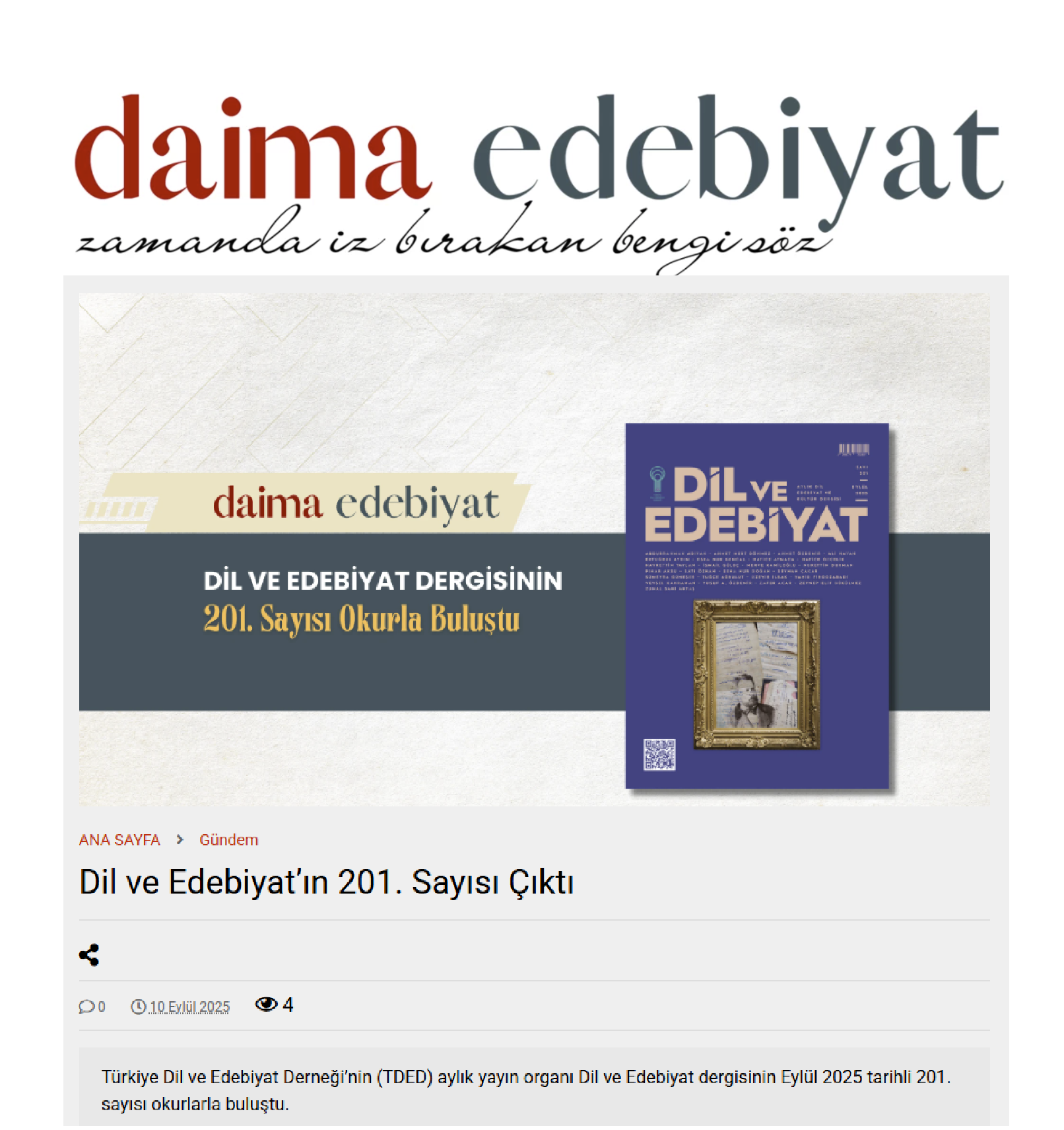 10/09/2025Türkiye Dil ve Edebiyat Derneği’nin (TDED) aylık yayın organı Dil ve Edebiyat dergisinin Eylül 2025 tarihli 201. sayısı okurlarla buluştu. Dergi, tded.org.tr adresinden ve Türk Telekom E-Dergi platformu üzerinden dijital olarak da okunabiliyor.