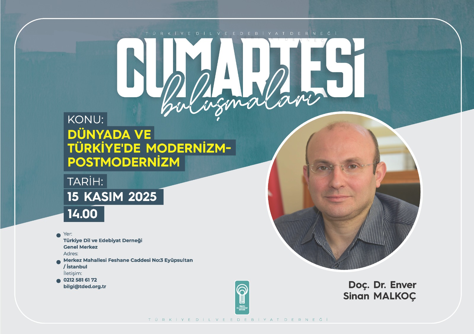 10/11/2025Türkiye Dil ve Edebiyat Derneği’nin (TDED) gelenekselleşen haftalık söyleşi programı “Cumartesi Buluşmaları”nda ayın ikinci konuşmacısı Doç. Dr. Enver Sinan Malkoç, “Dünyada ve Türkiye'de Modernizm- Postmodernizm” başlıklı bir konuşma yapacak.