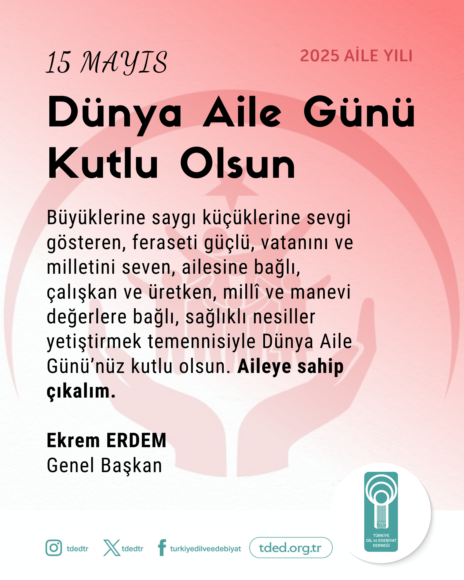 15/05/2025Büyüklerine saygı küçüklerine sevgi gösteren, feraseti güçlü, vatanını ve milletini seven, ailesine bağlı, çalışkan ve üretken, millî ve manevi değerlere bağlı, sağlıklı nesiller yetiştirmek temennisiyle Dünya Aile Günü’nüz kutlu olsun.