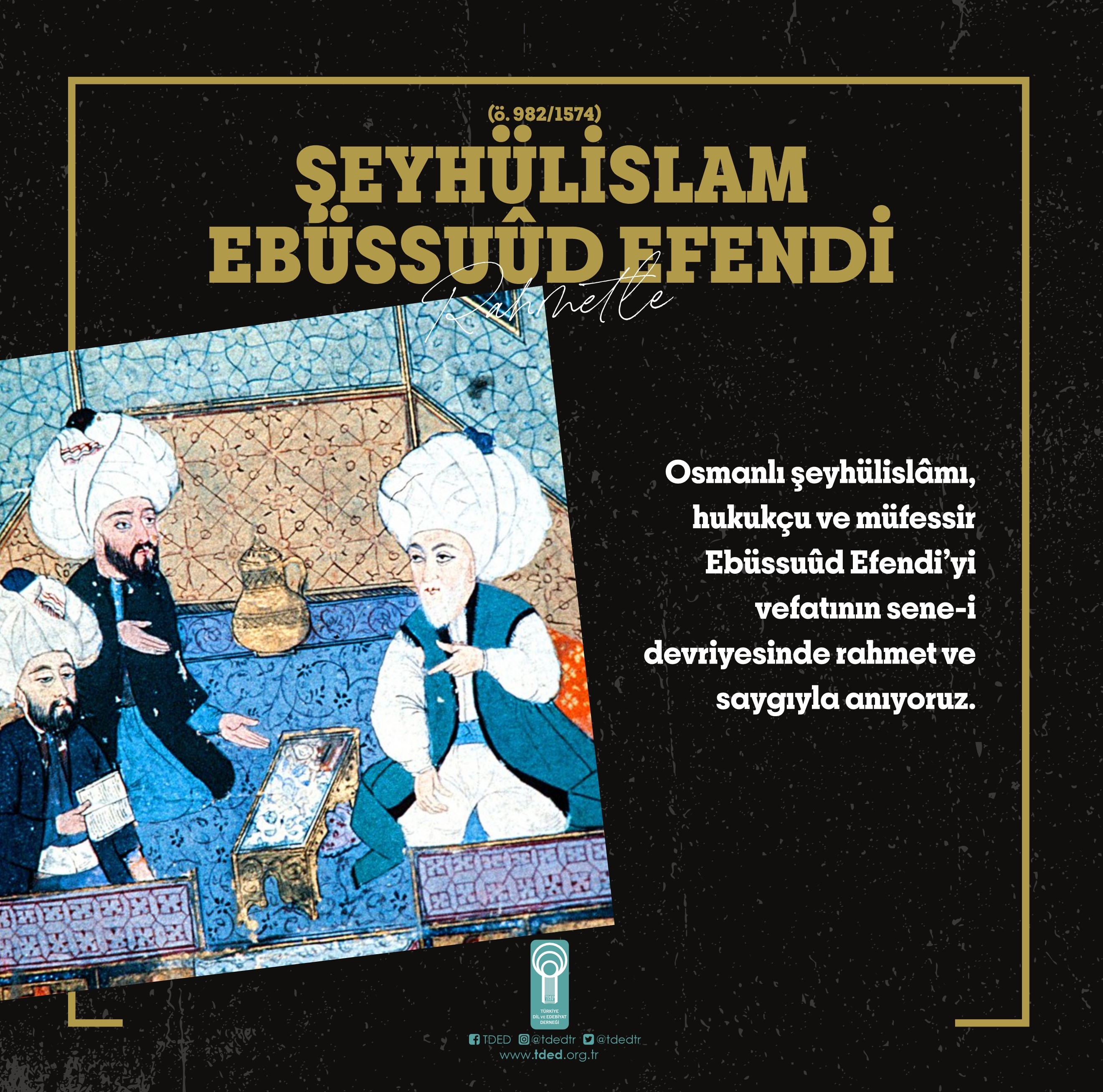 Anasayfa EBÜSSUÛD EFENDİ (ö. 982/1574) EBÜSSUÛD EFENDİ (ö. 982/1574) 24/08/2023 Osmanlı şeyhülislâmı, hukukçu ve müfessir Ebüssuûd Efendi’yi vefatının sene-i devriyesinde rahmet ve saygıyla anıyoruz. Şeyhülislam Ebüssuûd Efendi (ö. 982/1574) Galeri
