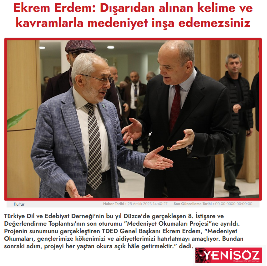 28/12/2023Türkiye Dil ve Edebiyat Derneği'nin bu yıl Düzce'de gerçekleşen 8. İstişare ve Değerlendirme Toplantısı'nın son oturumu "Medeniyet Okumaları Projesi"ne ayrıldı. Projenin sunumunu gerçekleştiren TDED Genel Başkanı Ekrem Erdem, "Medeniyet Okumaları, gençlerimize kökenimizi ve aidiyetlerimizi hatırlatmayı amaçlıyor. Bundan sonraki adım, projeyi her yaştan okura açık hâle getirmektir." dedi.