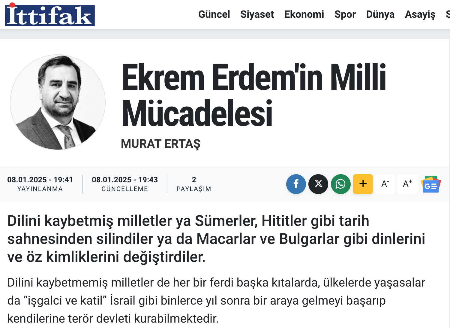 08/01/2025Dilini kaybetmiş milletler ya Sümerler, Hititler gibi tarih sahnesinden silindiler ya da Macarlar ve Bulgarlar gibi dinlerini ve öz kimliklerini değiştirdiler.