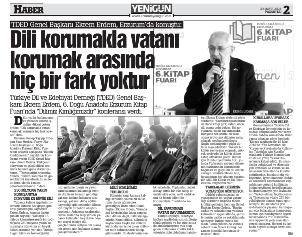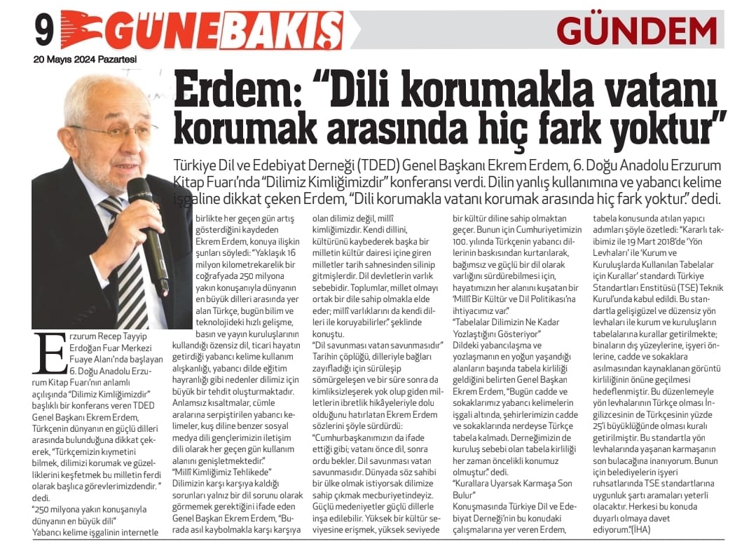18/05/2024Türkiye Dil ve Edebiyat Derneği (TDED) Genel Başkanı Ekrem Erdem, 6. Doğu Anadolu Erzurum Kitap Fuarı’nda “Dilimiz Kimliğimizdir” konferansı verdi. Dilin yanlış kullanımına ve yabancı kelime işgaline dikkat çeken Erdem, “Dili korumakla vatanı korumak arasında hiç fark yoktur.” dedi.