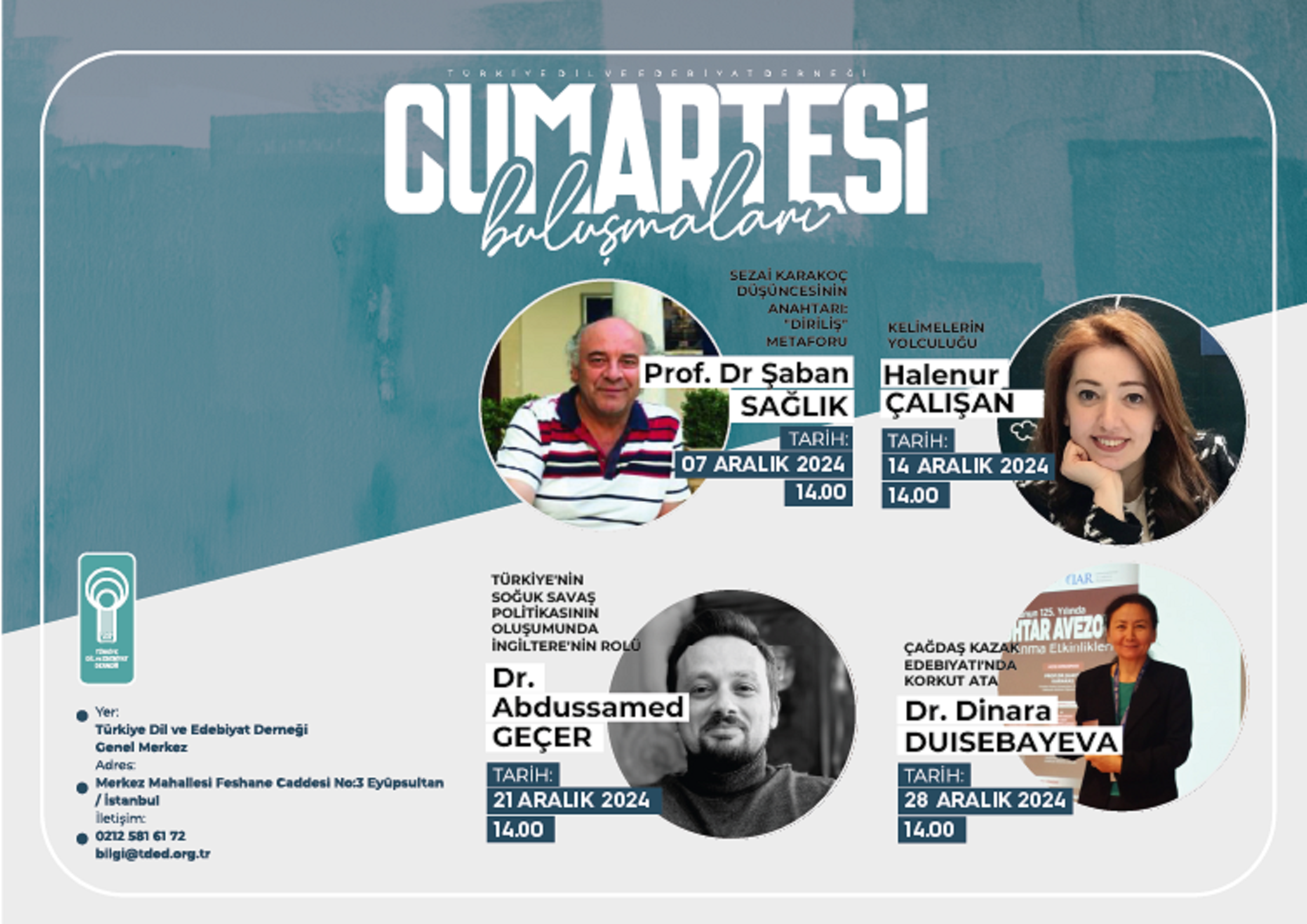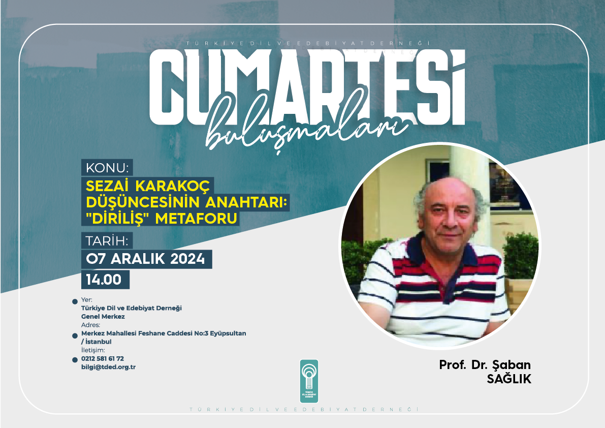 Türkiye Dil ve Edebiyat Derneği’nin (TDED) gelenekselleşen haftalık söyleşi programı “Cumartesi Buluşmaları” yılın son ayında zengin bir içerik sunuyor. Aralık konuşmacıları; Prof.Dr. Şaban Sağlık, Halenur Çalışan, Dr. Abdussamed Geçer, Dr. Dinara Duısebeyeva olacak.