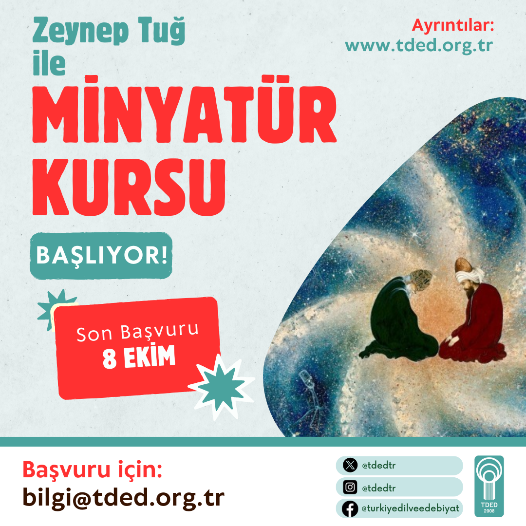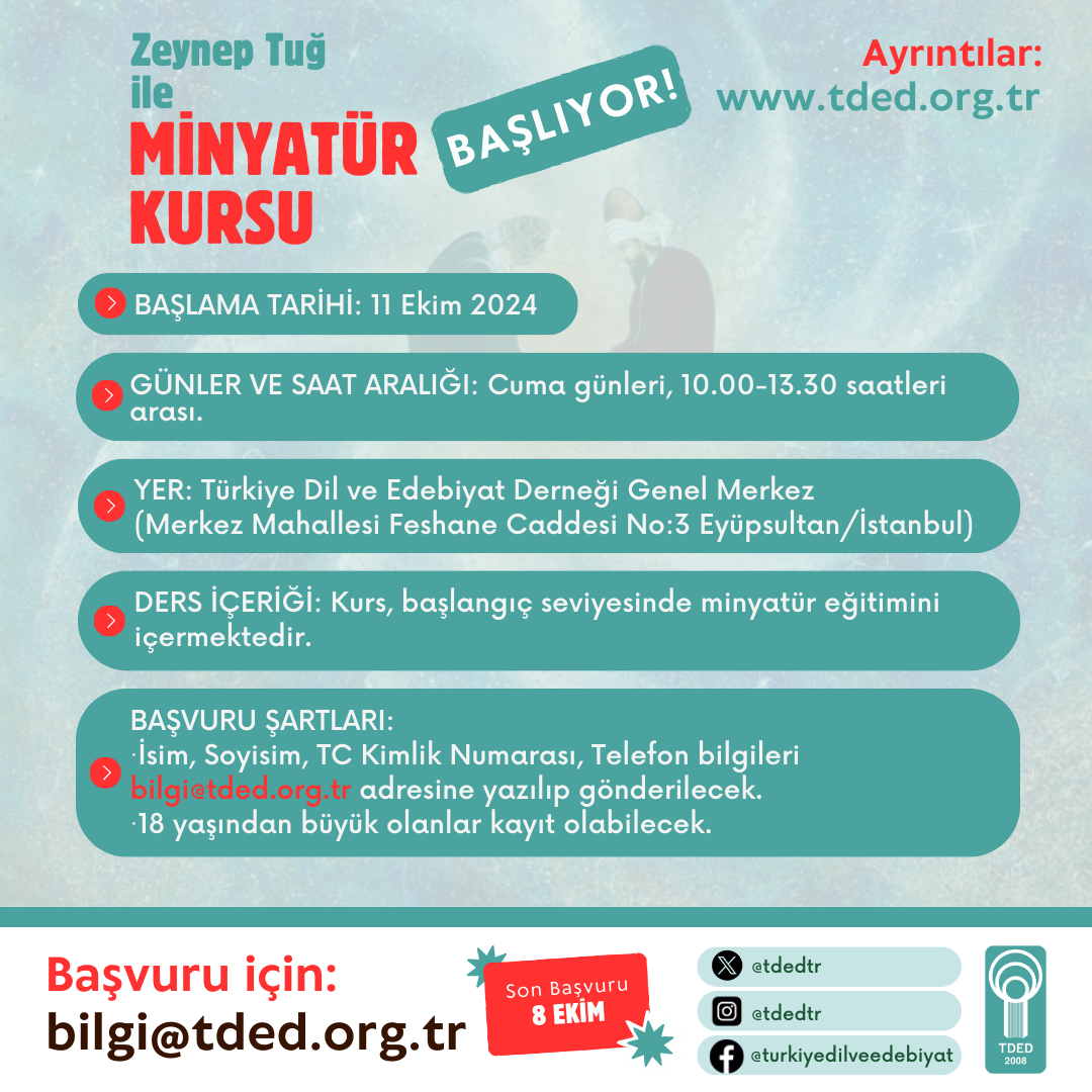 Türkiye Dil ve Edebiyat Derneği'nin Eyüpsultan Halk Eğitim Merkezi ile verdiği, sertifikalı ve ücretsiz Minyatür (başlangıç seviyesi) kursu 2024-2025 dönemi kayıtları başladı. Minyatür sanatçısı Zeynep Tuğ’un öğreticiliğini yaptığı kurs Ekim’in ikinci haftası başlayacak ve eğitimler yüz yüze gerçekleştirilecek.