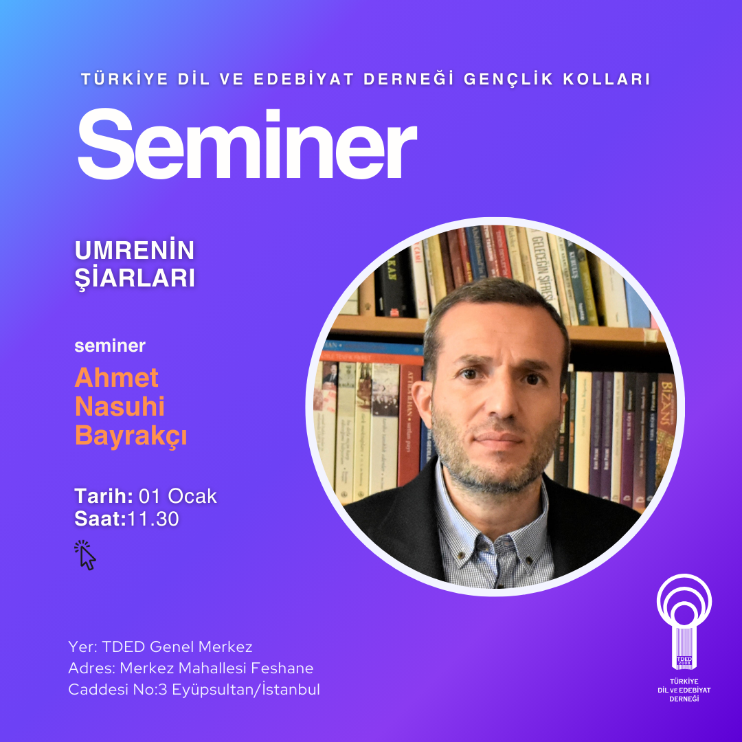Türkiye Dil ve Edebiyat Derneği (TDED) Gençlik Kolları Başkanı Ahmet Nasuhi Bayrakçı, “Umrenin Şiarları” başlıklı bir seminer verecek. 1 Ocak 2025 Çarşamba günü saat 11.30’da derneğin Genel Merkez’inde gerçekleşecek seminere bütün gençler davetli, katılım serbest.
