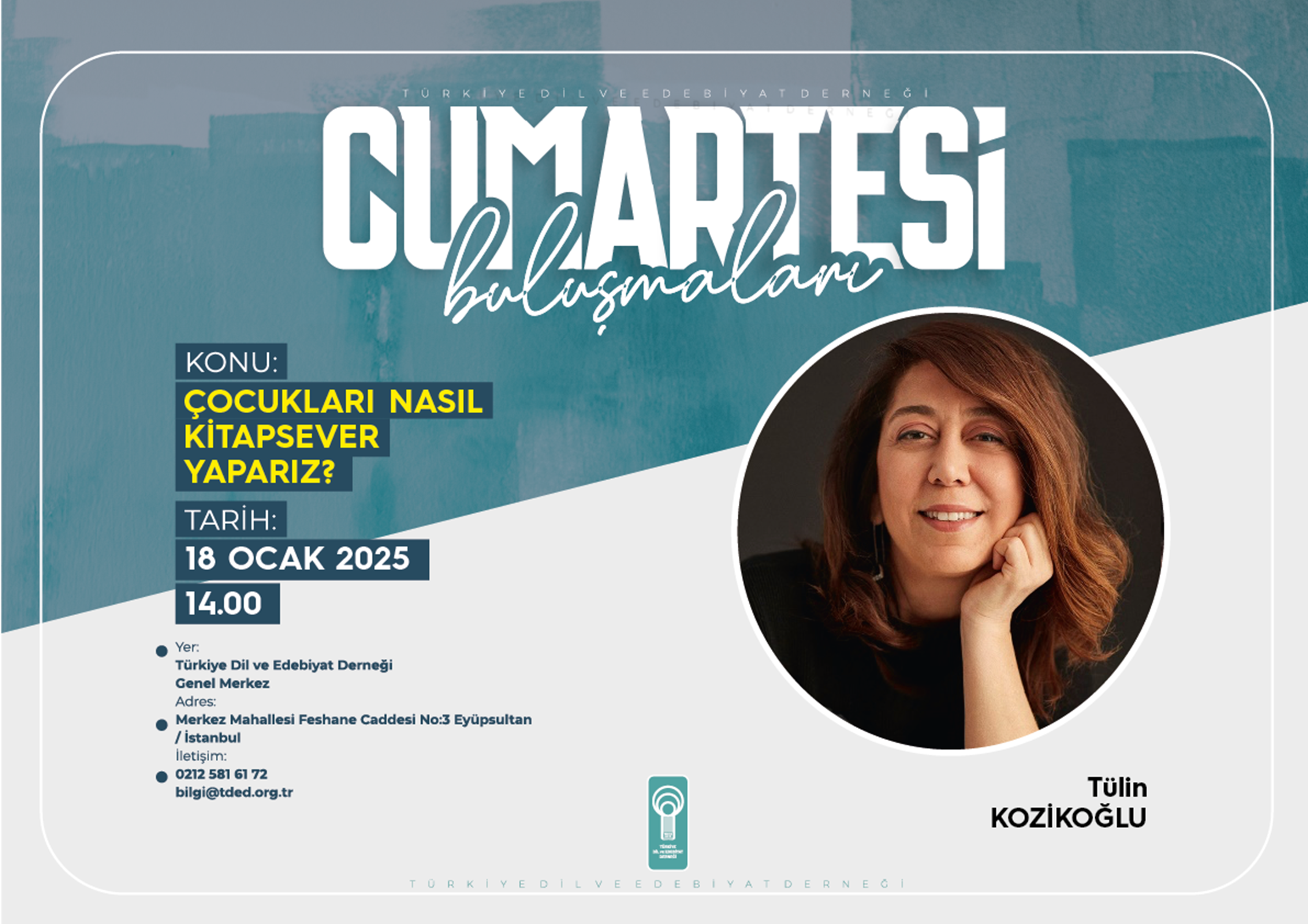 Türkiye Dil ve Edebiyat Derneği’nin (TDED) haftalık söyleşi programı “Cumartesi Buluşmaları”nda yazar Tülin Kozikoğlu, “Çocukları Nasıl Kitapsever Yaparız?” başlıklı bir konuşma yapacak.