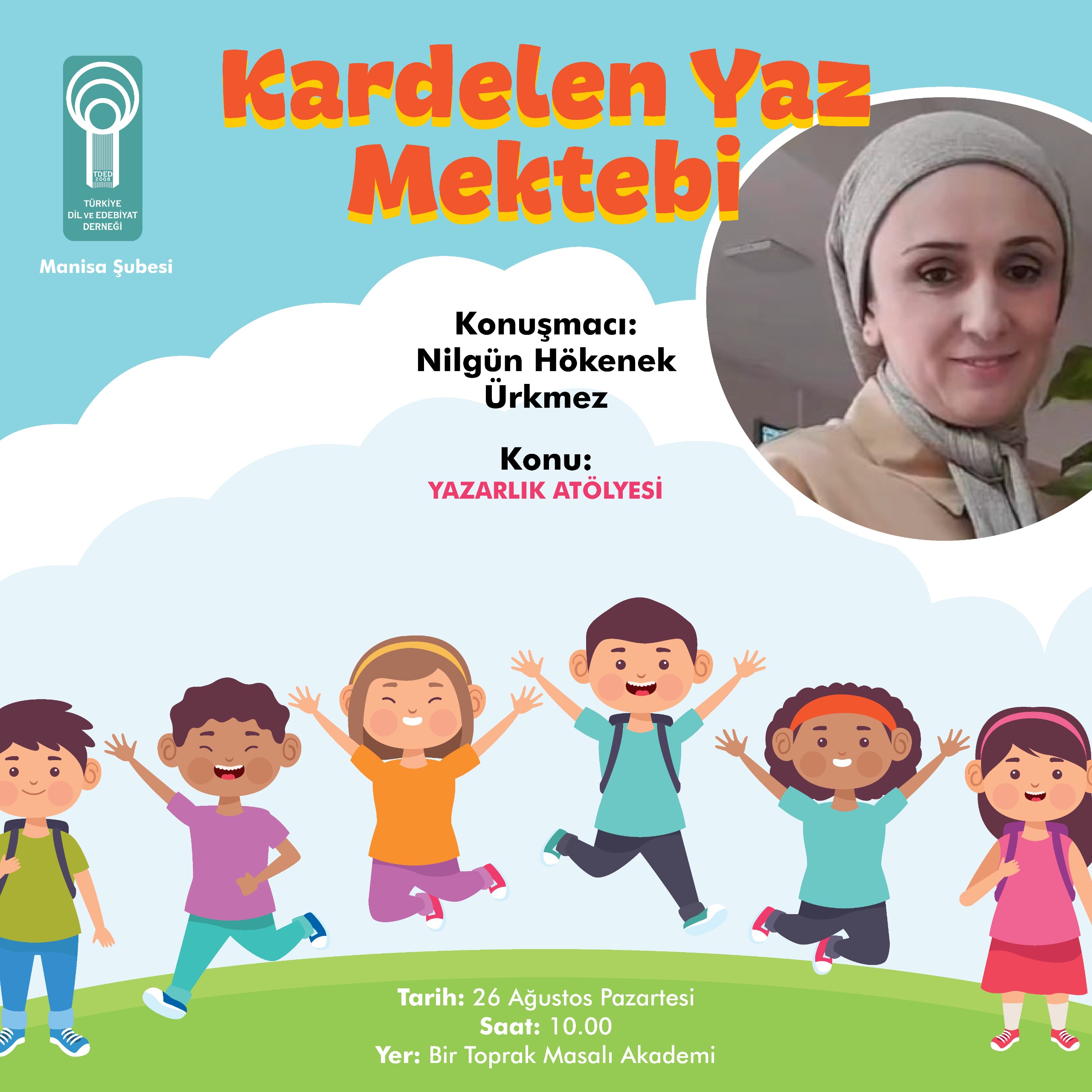 Anasayfa Faaliyetler ÜRKMEZ İLE YAZARLIK ATÖLYESİ ÜRKMEZ İLE YAZARLIK ATÖLYESİ TDED Manisa Kardelen Yaz MektebiKonuşmacı: Nilgün Hökenek ÜrkmezKonu: Yazarlık Atölyesi26 Ağustos Pazartesi10.00Bir Toprak Masalı Akademi Galeri
