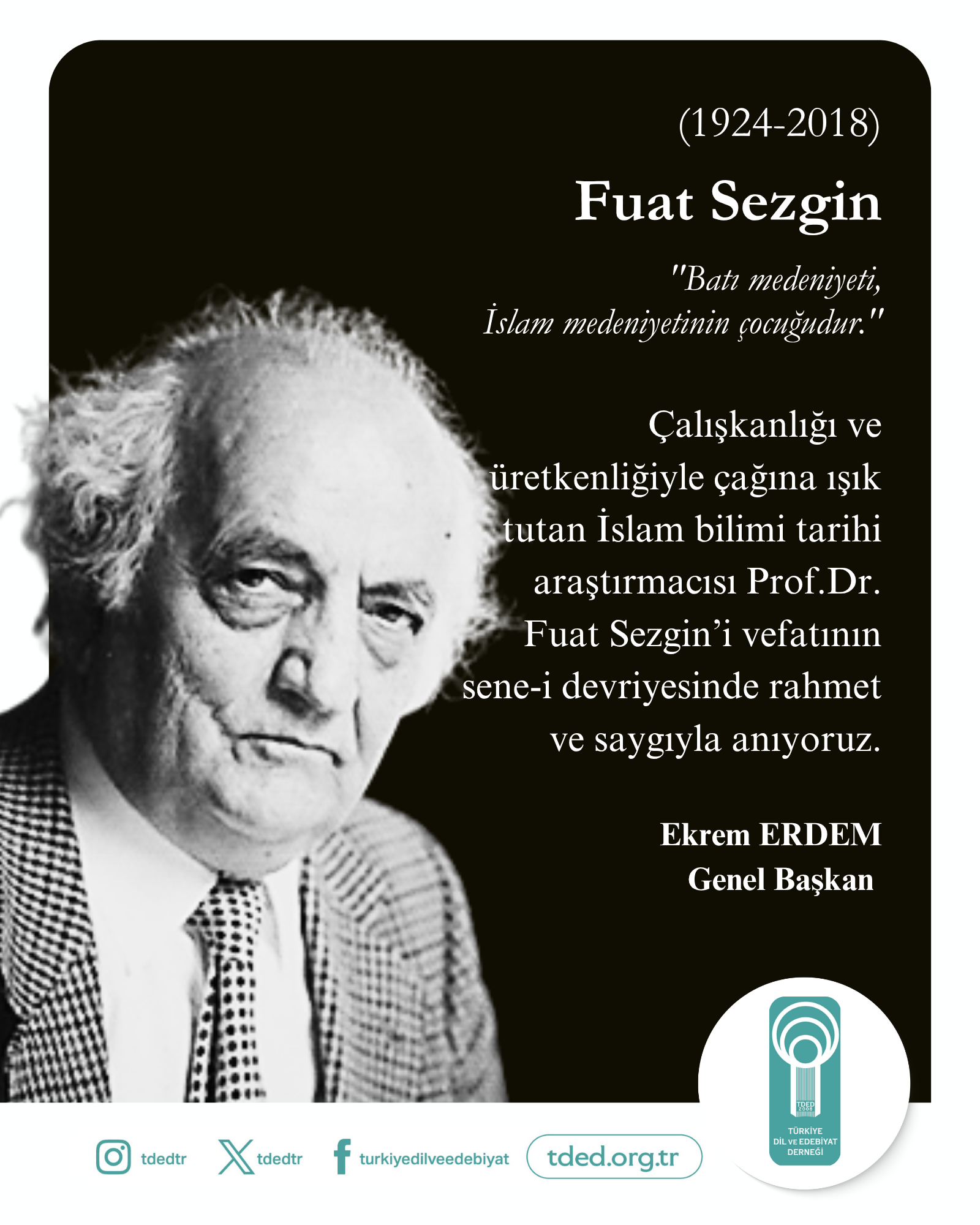Çalışkanlığı ve üretkenliğiyle çağına ışık tutan İslam bilimi tarihi araştırmacısı Prof.Dr. Fuat Sezgin’i vefatının sene-i devriyesinde rahmet ve saygıyla anıyoruz.