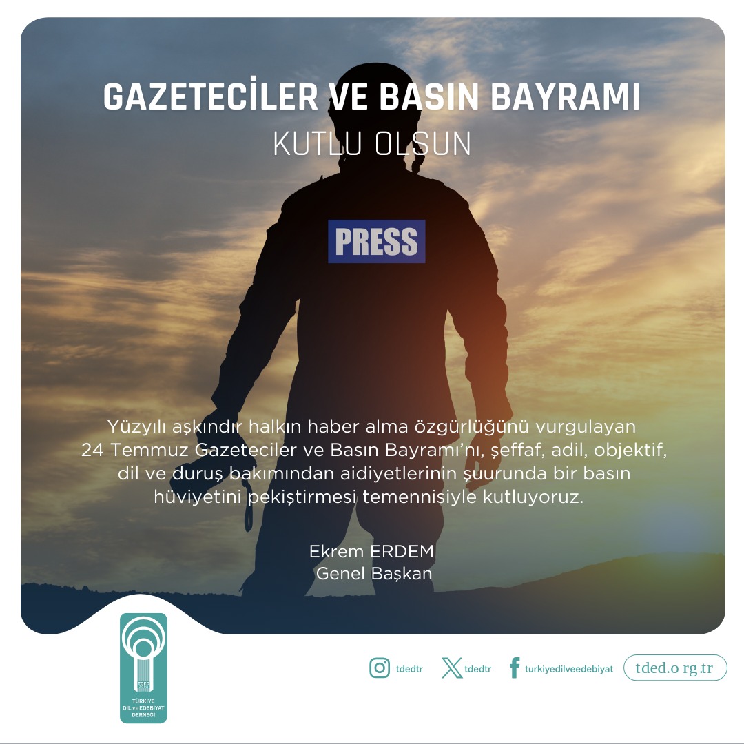 24/07/2024Yüzyılı aşkındır halkın haber alma özgürlüğünü vurgulayan 24 Temmuz Gazeteciler ve Basın Bayramı’nı, şeffaf, adil, objektif, dil ve duruş bakımından aidiyetlerinin şuurunda bir basın hüviyetini pekiştirmesi temennisiyle kutluyoruz.