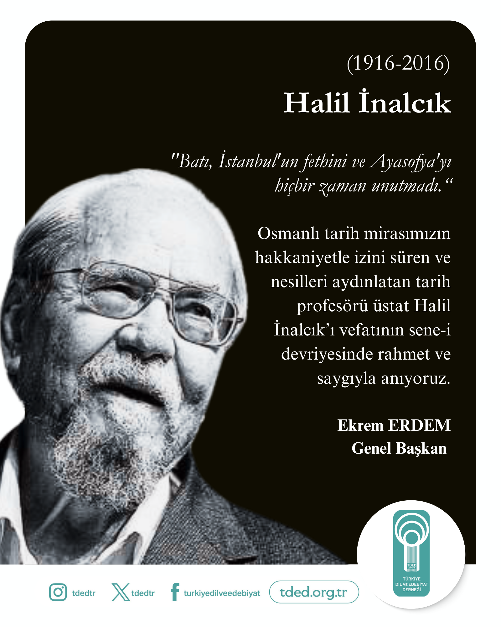 Osmanlı tarih mirasımızın hakkaniyetle izini süren ve nesilleri aydınlatan tarih profesörü üstat Halil İnalcık’ı vefatının sene-i devriyesinde rahmet ve saygıyla anıyoruz.