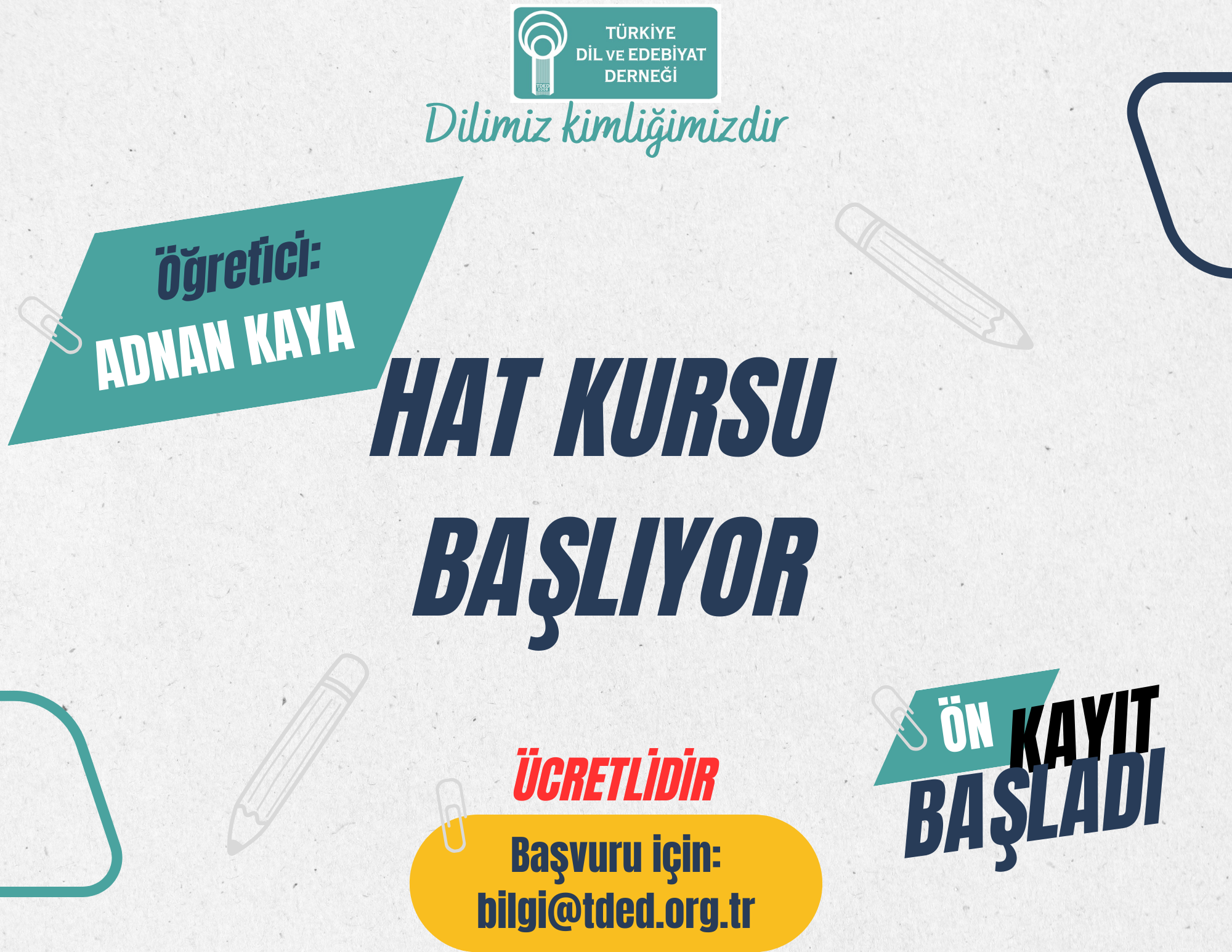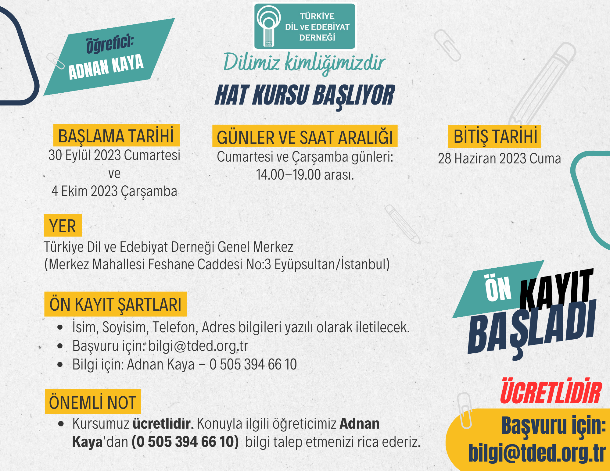 Türkiye Dil ve Edebiyat Derneği’nde verilen Hat Kursu”nun 2023-2024 Dönemi başlıyor. Adnan Kaya’nın öğreticiliğini yaptığı kurs, 30 Eylül 2023 Cumartesi günü başlayacak, eğitimler yüz yüze gerçekleştirilecek.
