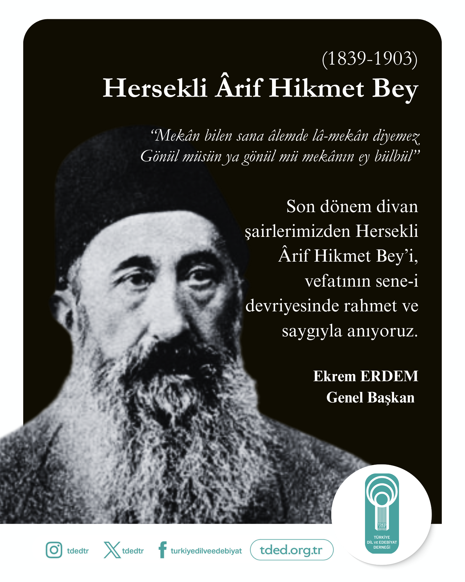 Son dönem divan şairlerimizden Hersekli Ârif Hikmet Bey’i, vefatının sene-i devriyesinde rahmet ve saygıyla anıyoruz.