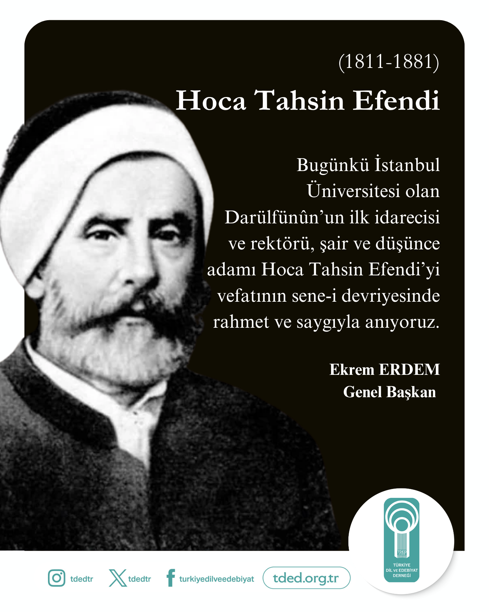 03/07/2025Bugünkü İstanbul Üniversitesi olan Darülfünûn’un ilk idarecisi ve rektörü, şair ve düşünce adamı Hoca Tahsin Efendi’yi vefatının sene-i devriyesinde rahmet ve saygıyla anıyoruz.