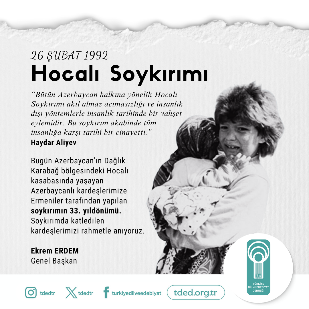 26/02/2025Bugün Azerbaycan'ın Dağlık Karabağ bölgesindeki Hocalı kasabasında yaşayan Azerbaycanlı kardeşlerimize Ermeniler tarafından yapılan soykırımın 33'üncü yıldönümü.