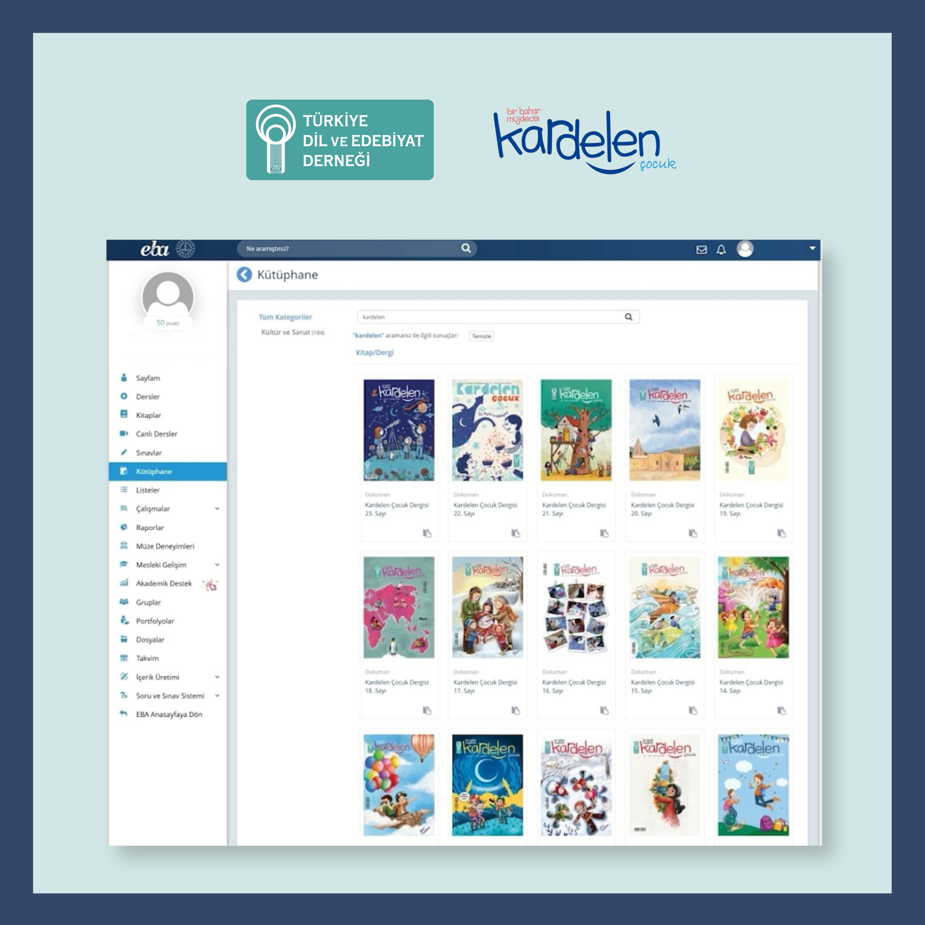 09/03/2026Türkiye Dil ve Edebiyat Derneği (TDED) tarafından iki ayda bir yayımlanan ve çocuklara Türkçe hassasiyeti kazandırmayı amaçlayan “Kardelen Çocuk” dergisi, Millî Eğitim Bakanlığıyla iş birliği çerçevesinde çevrim içi dijital eğitim platformu EBA’nın (Eğitim Bilişim Ağı) “Kütüphane”sinde yerini aldı. Bütün sayıların yayımlandığı Kardelen Çocuk sayfasına aşağıdaki bağlantı üzerinden ulaşabilirsiniz.