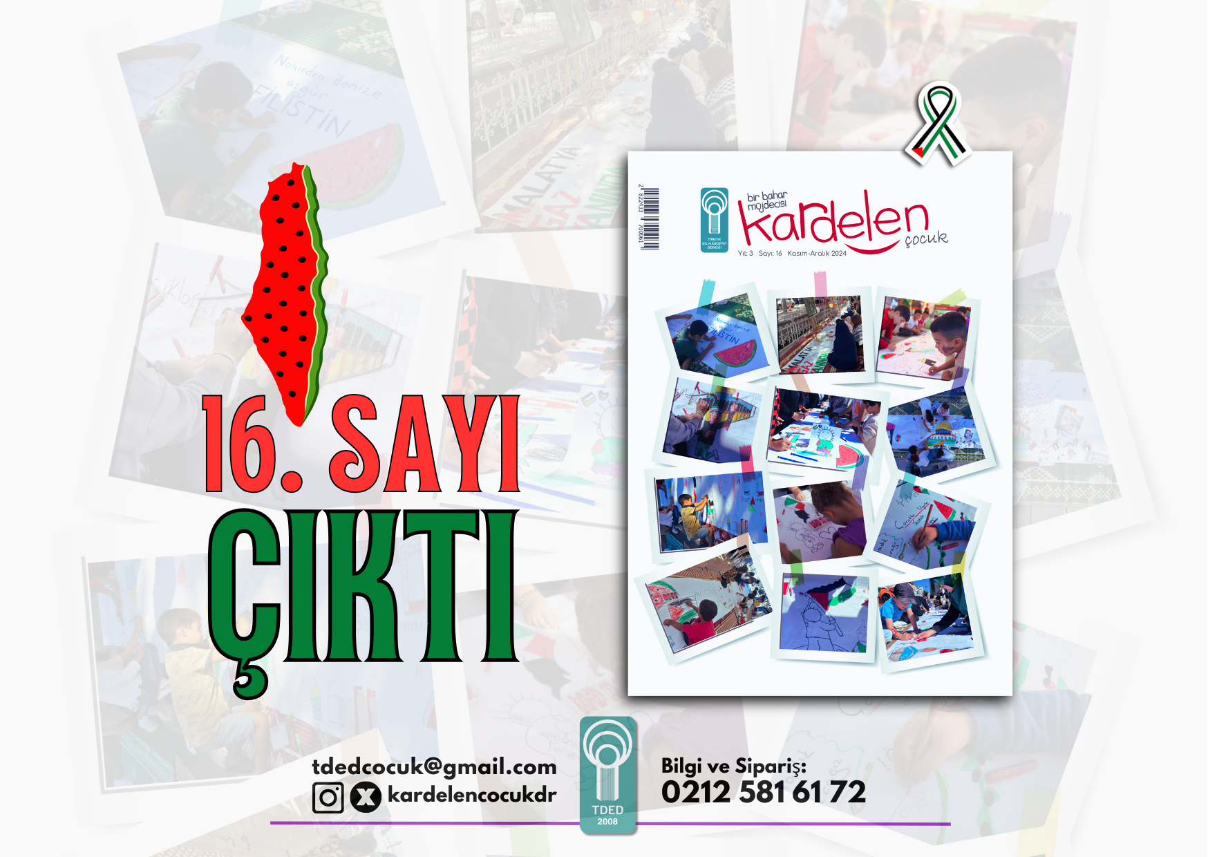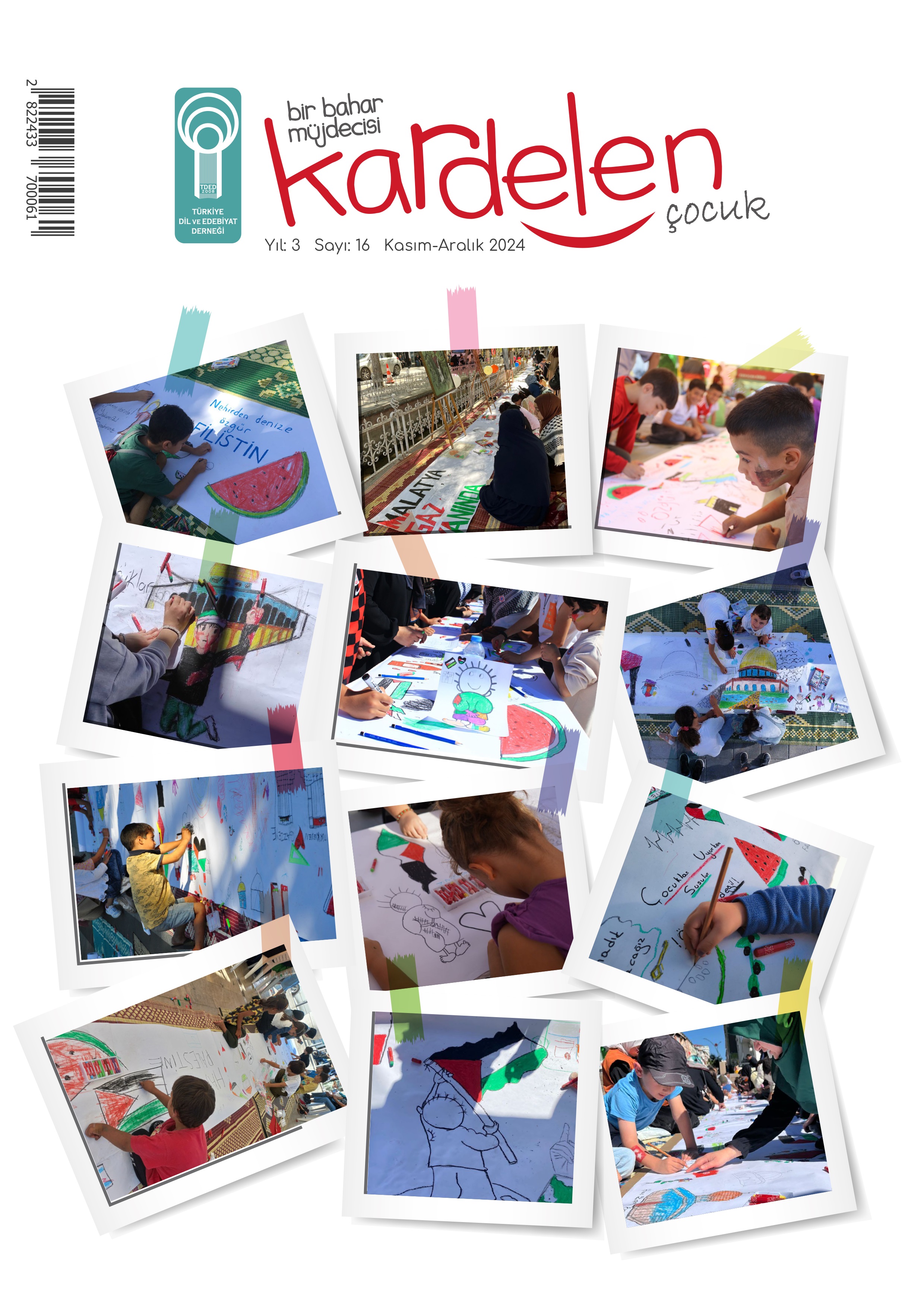 Türkiye Dil ve Edebiyat Derneği (TDED) tarafından iki ayda bir yayımlanan ve çocuklara Türkçe hassasiyeti kazandırmayı amaçlayan Kardelen Çocuk’un 16. sayısı, Yetim Vakfı’nın 81 ilimizde Filistin temalı resim çizme etkinliğine dair fotoğrafları ön ve arka kapağına taşıdı.