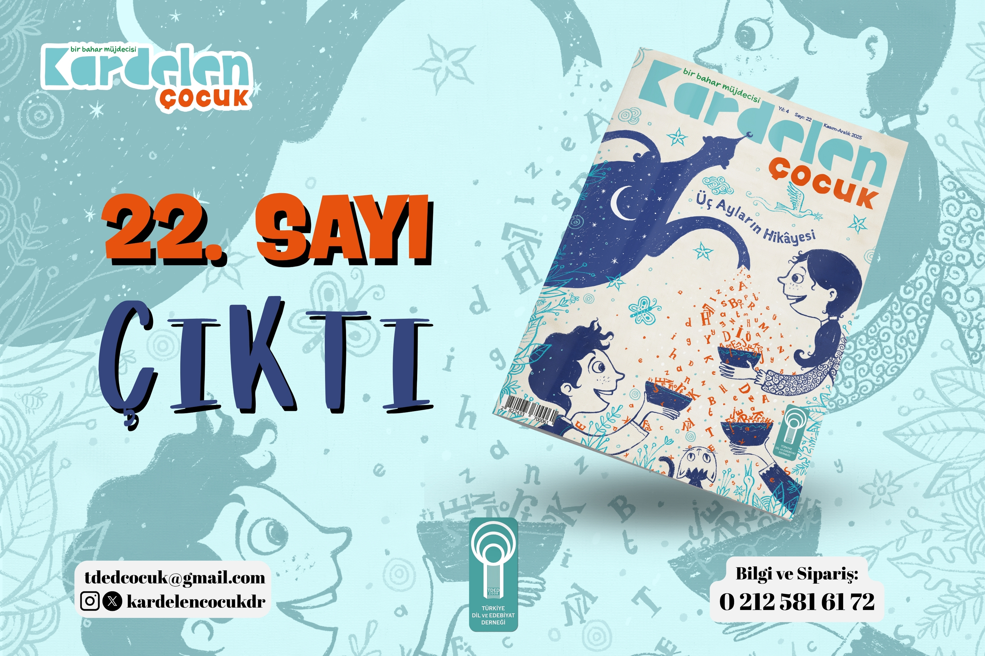 Türkiye Dil ve Edebiyat Derneği (TDED) tarafından iki ayda bir yayımlanan ve çocuklara Türkçe hassasiyeti kazandırmayı amaçlayan Kardelen Çocuk’un 22. sayısı yepyeni logosu ve “Üç Ayların Hikâyesi” dosyasının yanı sıra en güzel masallar, hikâyeler, şiirler, gezi yazıları, eğitici içerikler, bulmaca ve etkinlikler içeriyor.
