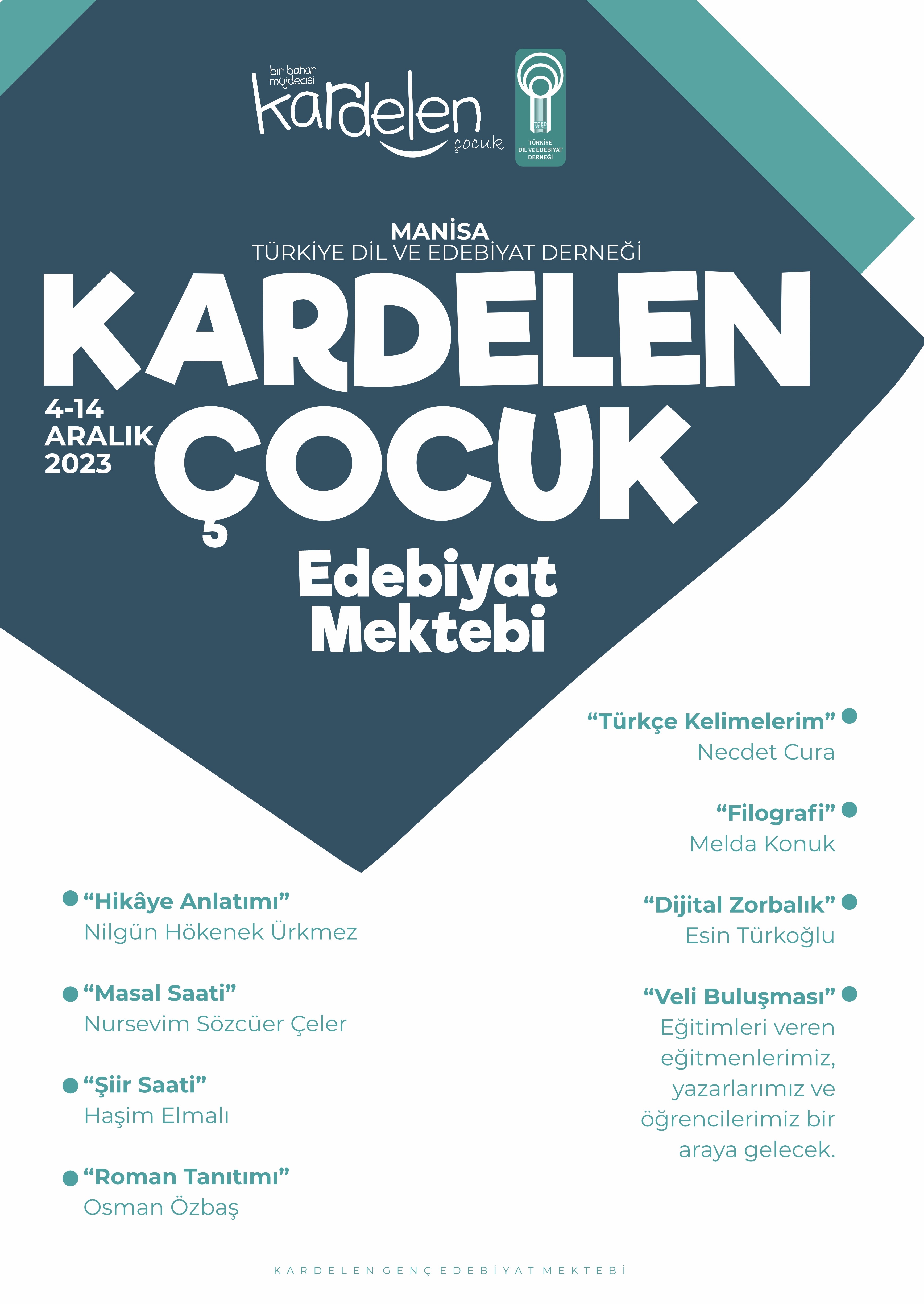 02/12/2023Kardelen Çocuk dergisinin “Kardelen Okulu Projesi”, TDED Manisa aracılığı ile "Kardelen Çocuk Mektebi” olarak Manisa’da Cumhuriyet İlkokulu’nda yeniden başlıyor. Çocuk edebiyatı yazar ve şairleriyle alanında uzman eğitimcileri ortaokul öğrencileriyle buluşturacak olan yazarlık eğitimi 2 hafta sürecek.