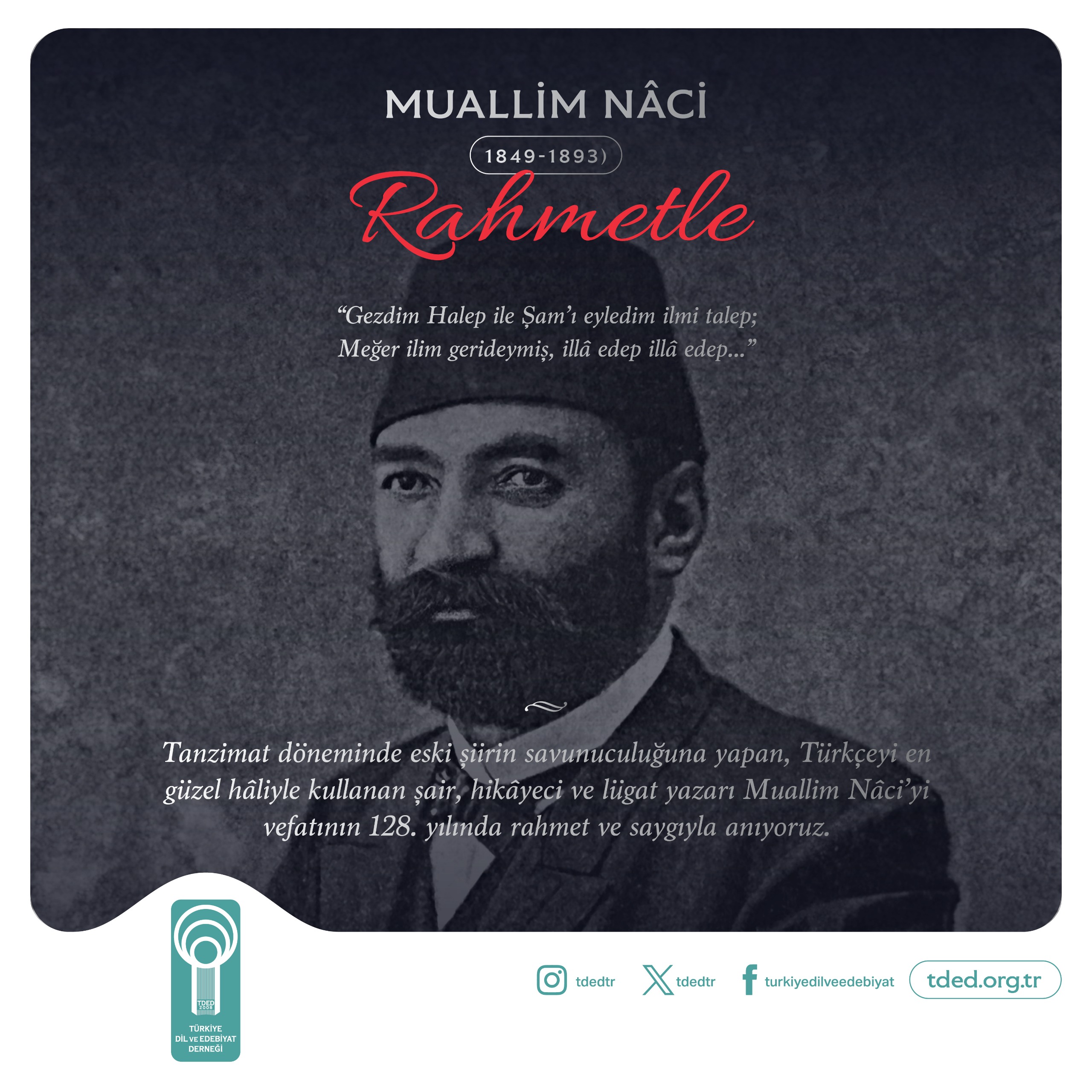 Tanzimat döneminde eski şiirin savunuculuğuna yapan, Türkçeyi en güzel hâliyle kullanan şair, hikâyeci ve lügat yazarı Muallim Nâci’yi vefatının 128. yılında rahmet ve saygıyla anıyoruz.