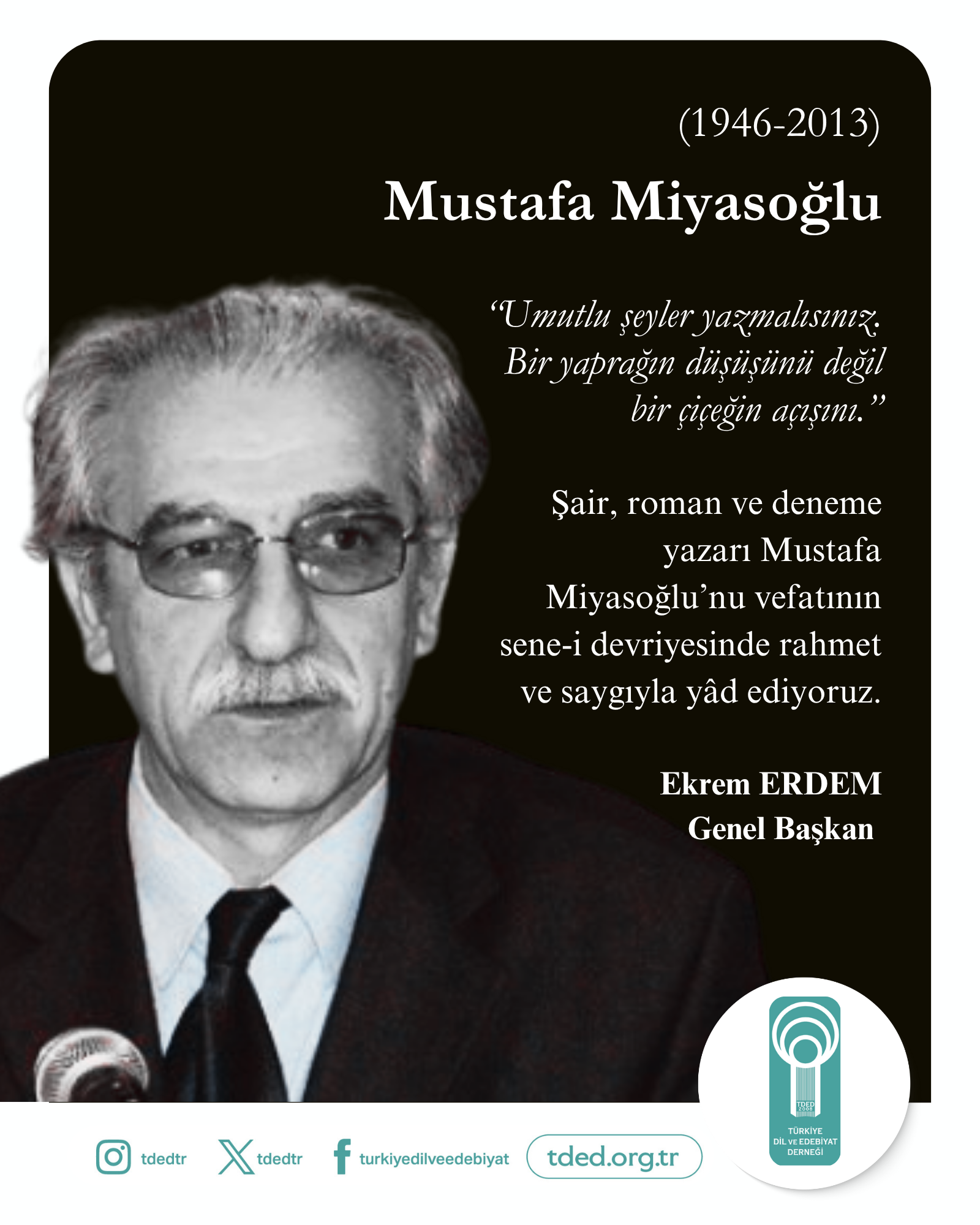 Şair, roman ve deneme yazarı Mustafa Miyasoğlu’nu vefatının sene-i devriyesinde rahmet ve saygıyla yâd ediyoruz.