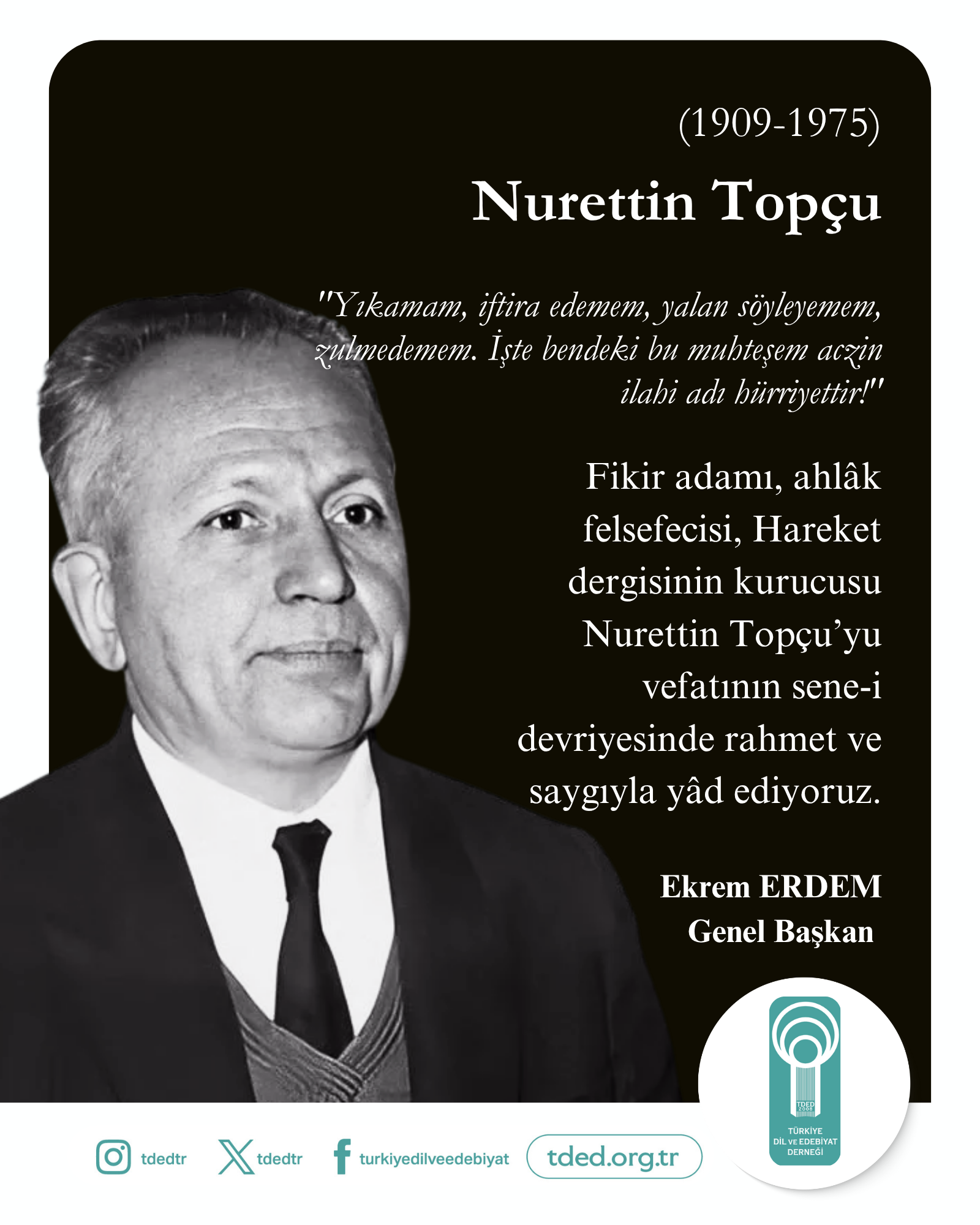 Fikir adamı, ahlâk felsefecisi, Hareket dergisinin kurucusu Nurettin Topçu’yu vefatının sene-i devriyesinde rahmet ve saygıyla yâd ediyoruz.