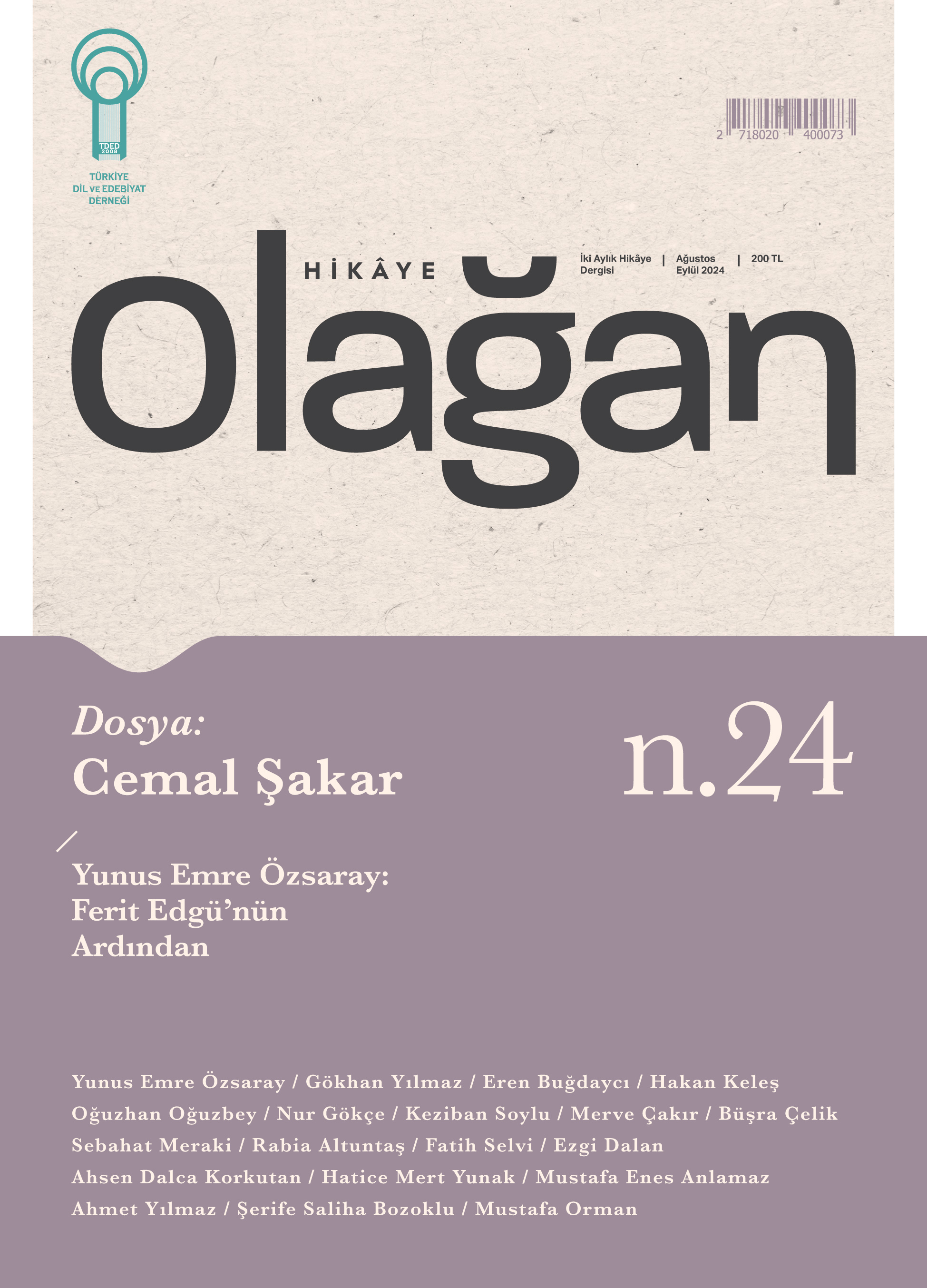 Türkiye Dil ve Edebiyat Derneği tarafından iki ayda bir yayımlanan Olağan Hikâye, edebiyata ömür vermiş hikâyecilerimizden “Cemal Şakar” dosyasıyla çıktı. 24. sayıda özgün hikâyeler, düşünce yazıları, incelemeler, soruşturmalar, eleştiriler, analizler, diyaloglar da yer alıyor.