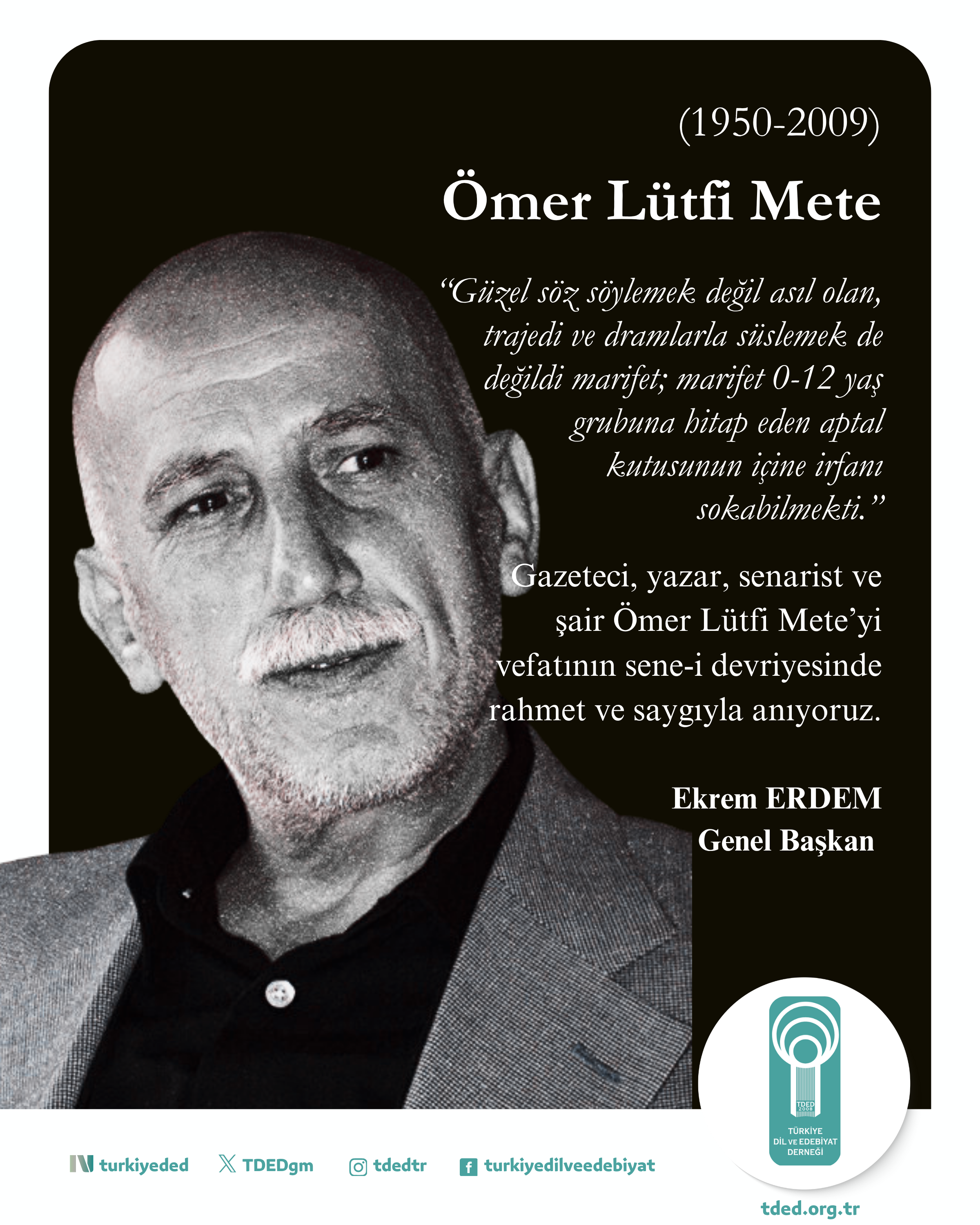 Gazeteci, yazar, senarist ve şair Ömer Lütfi Mete’yi vefatının sene-i devriyesinde rahmet ve saygıyla anıyoruz.