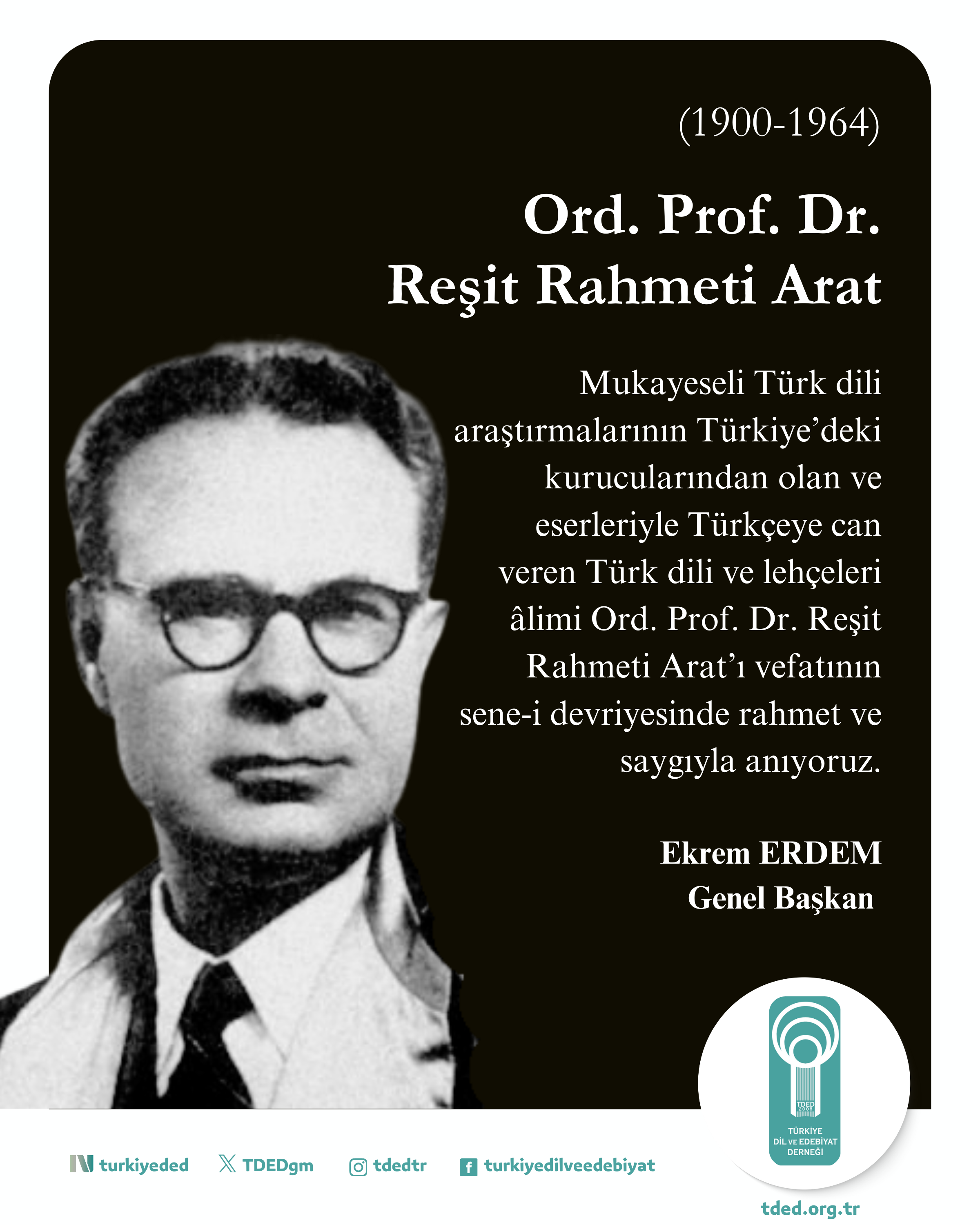 30/11/2025Mukayeseli Türk dili araştırmalarının Türkiye’deki kurucularından olan ve eserleriyle Türkçeye can veren Türk dili ve lehçeleri âlimi Ord. Prof. Dr. Reşit Rahmeti Arat’ı vefatının sene-i devriyesinde rahmet ve saygıyla anıyoruz.