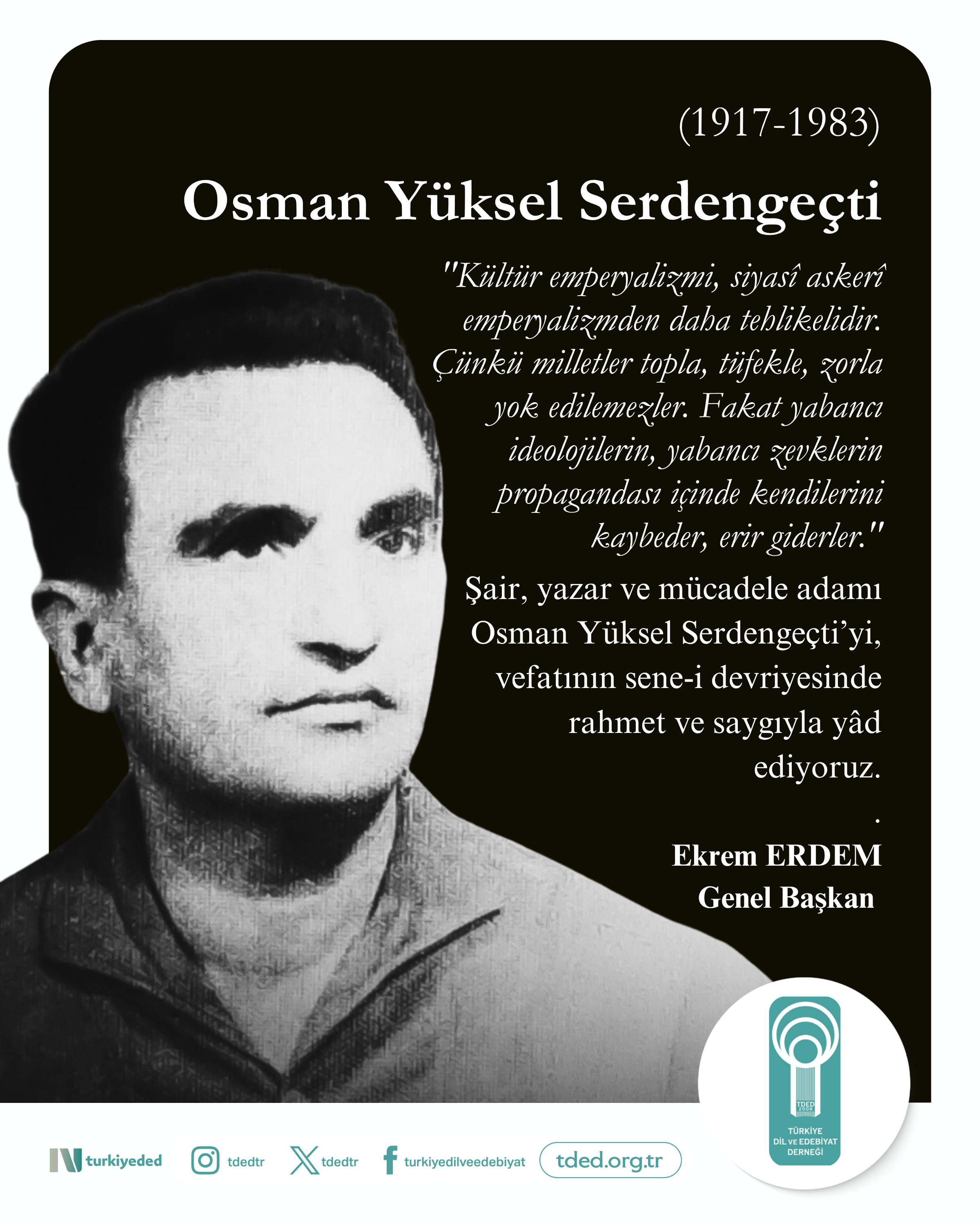 Şair, yazar ve mücadele adamı Osman Yüksel Serdengeçti’yi, vefatının sene-i devriyesinde rahmet ve saygıyla yâd ediyoruz.