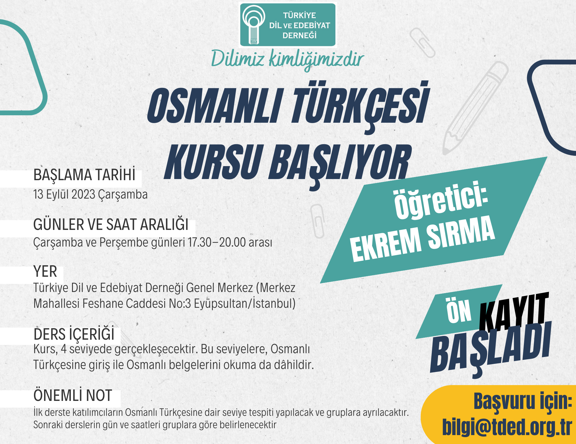 28/08/2023Türkiye Dil ve Edebiyat Derneği (TDED) YK Üyesi Ekrem Sırma’nın öğreticiliğini yaptığı Osmanlı Türkçesi Kursu için ön kayıtlar başladı.