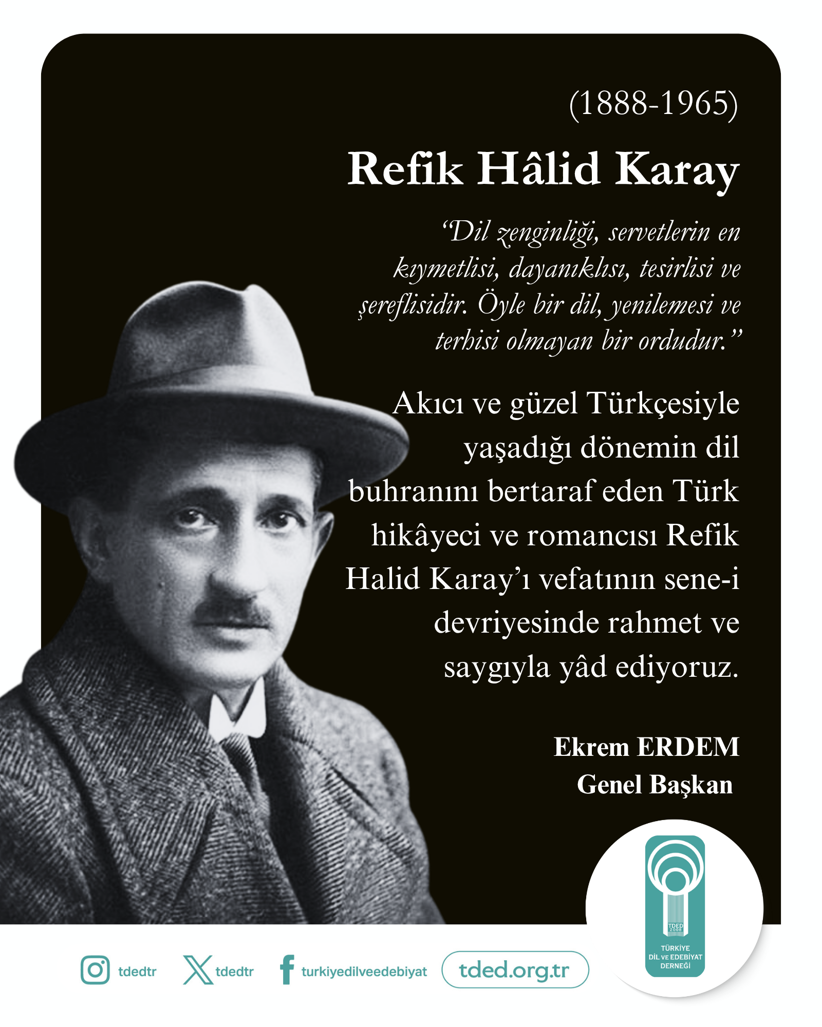 Akıcı ve güzel Türkçesiyle yaşadığı dönemin dil buhranını bertaraf eden Türk hikâyeci ve romancısı Refik Halid Karay’ı vefatının sene-i devriyesinde rahmet ve saygıyla yâd ediyoruz.