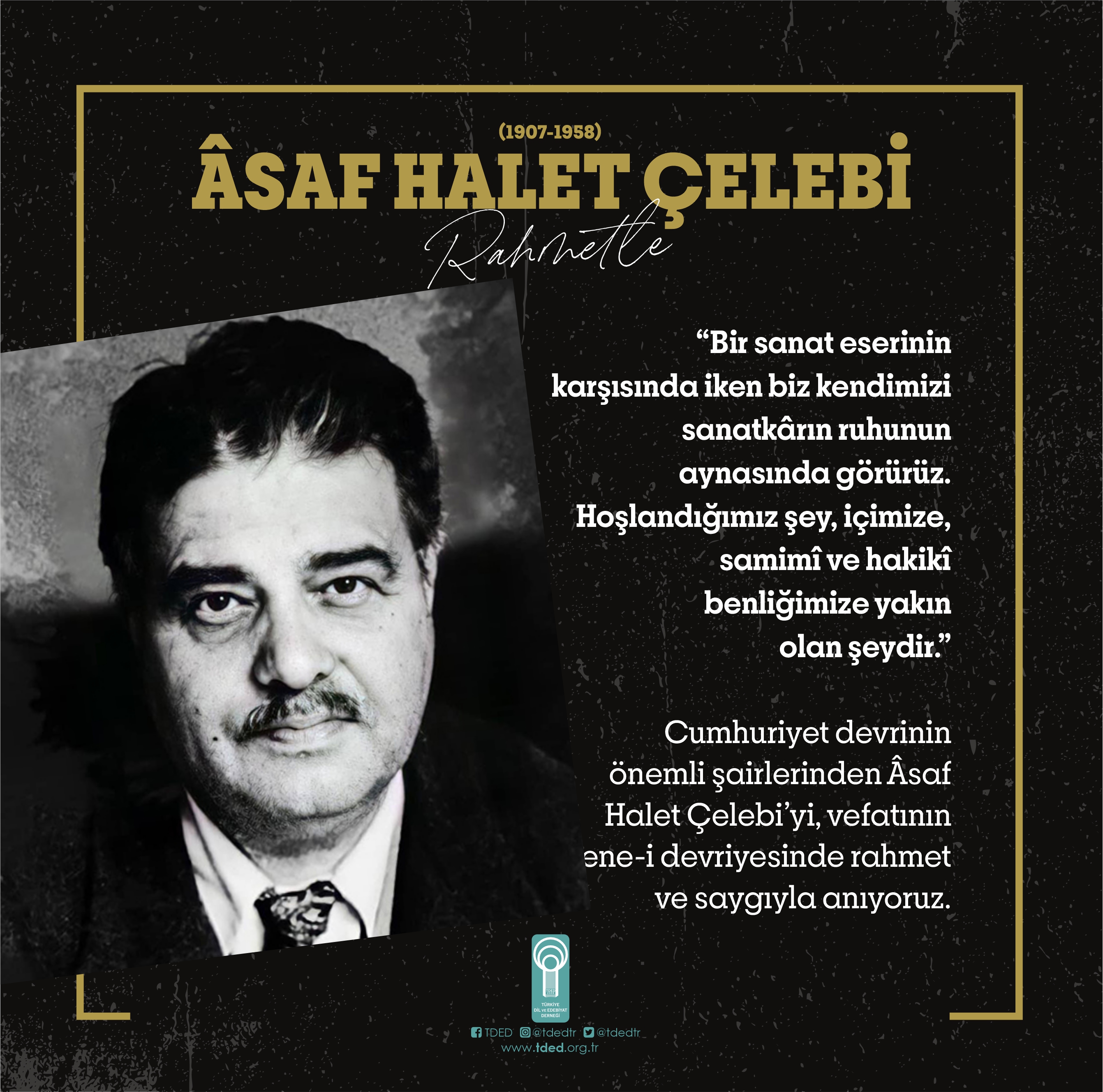 Cumhuriyet devrinin önemli şairlerinden Âsaf Halet Çelebi’yi, vefatının sene-i devriyesinde rahmet ve saygıyla anıyoruz.