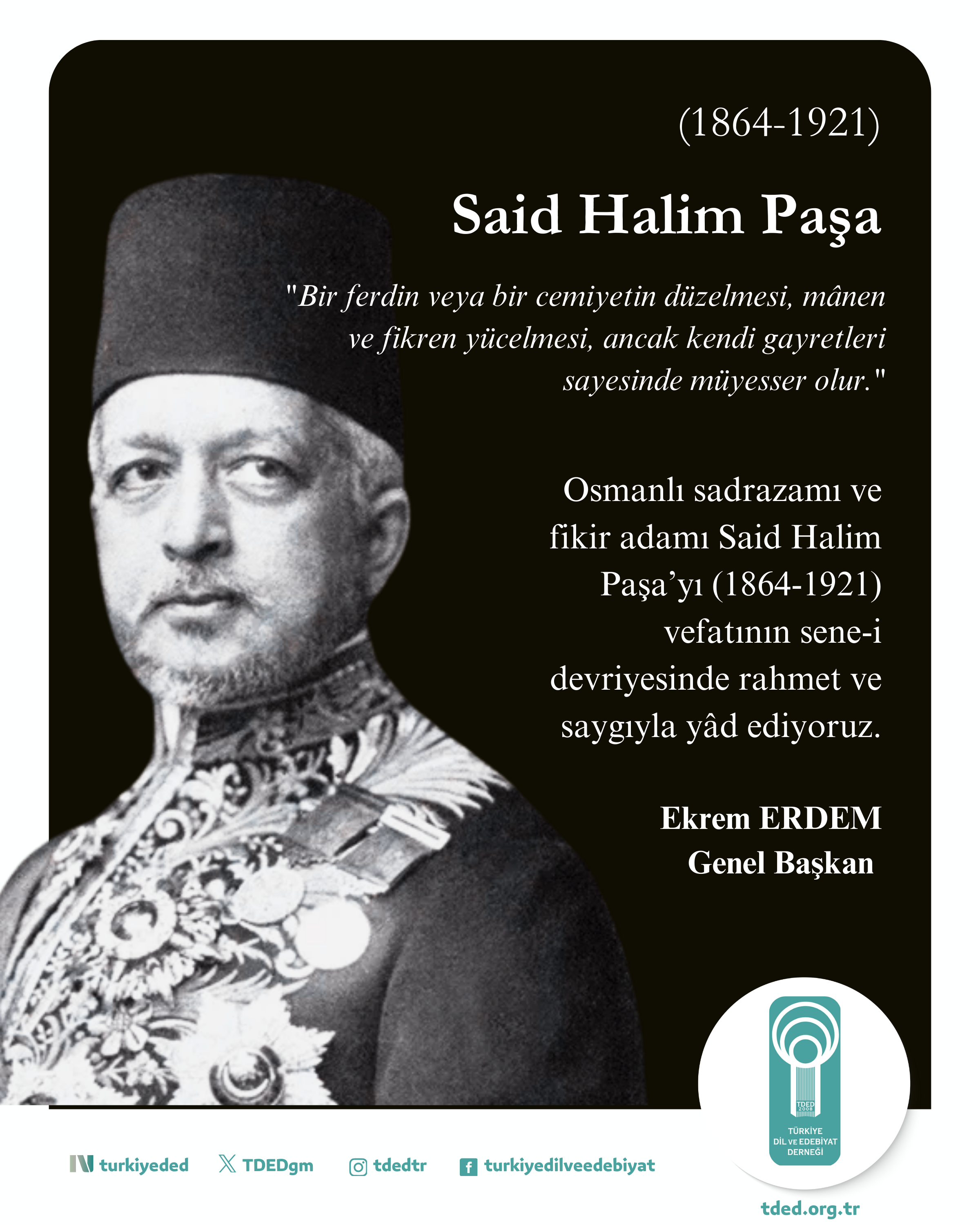 Osmanlı sadrazamı ve fikir adamı Said Halim Paşa’yı (1864-1921) vefatının sene-i devriyesinde rahmet ve saygıyla yâd ediyoruz.