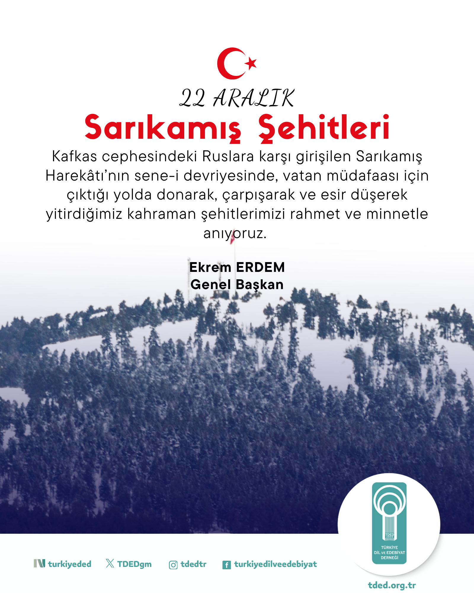 22/12/2025Kafkas cephesindeki Ruslara karşı girişilen Sarıkamış Harekâtı’nın sene-i devriyesinde, vatan müdafaası için çıktığı yolda donarak, çarpışarak ve esir düşerek yitirdiğimiz kahraman şehitlerimizi rahmet ve minnetle anıyoruz.