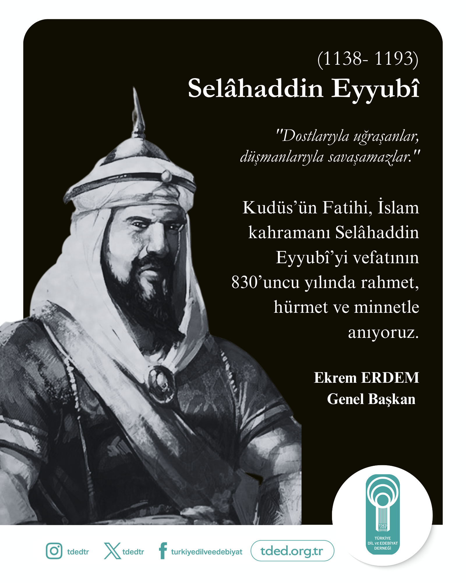 Kudüs’ün Fatihi, İslam kahramanı Selâhaddin Eyyubî’yi vefatının 830’uncu yılında rahmet, hürmet ve minnetle anıyoruz.